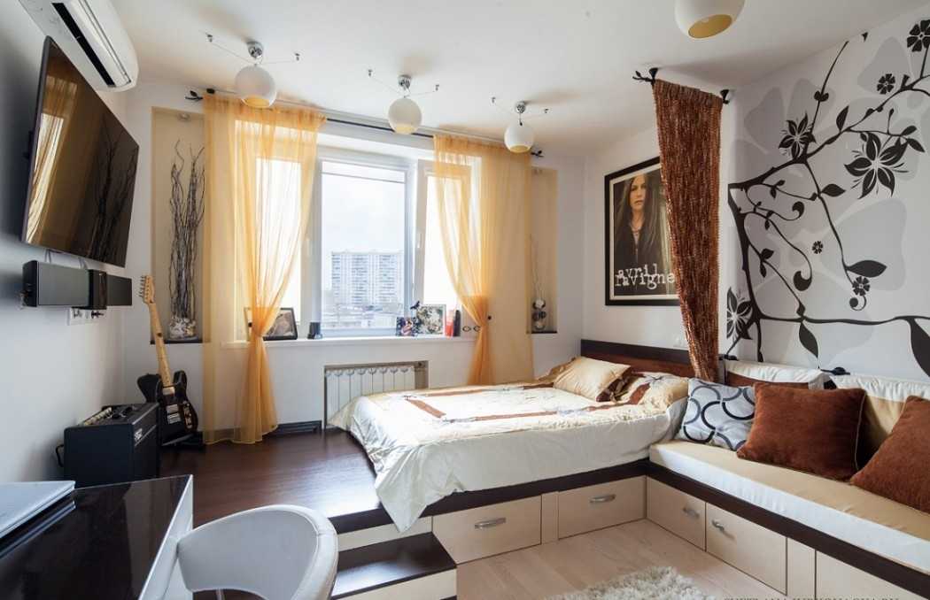 Проживая в просторной комнате, разделить ее на зоны оказывается проще всего. Плюс в том, что образуются две раздельные комнаты, причем с отличной звукоизоляцией.