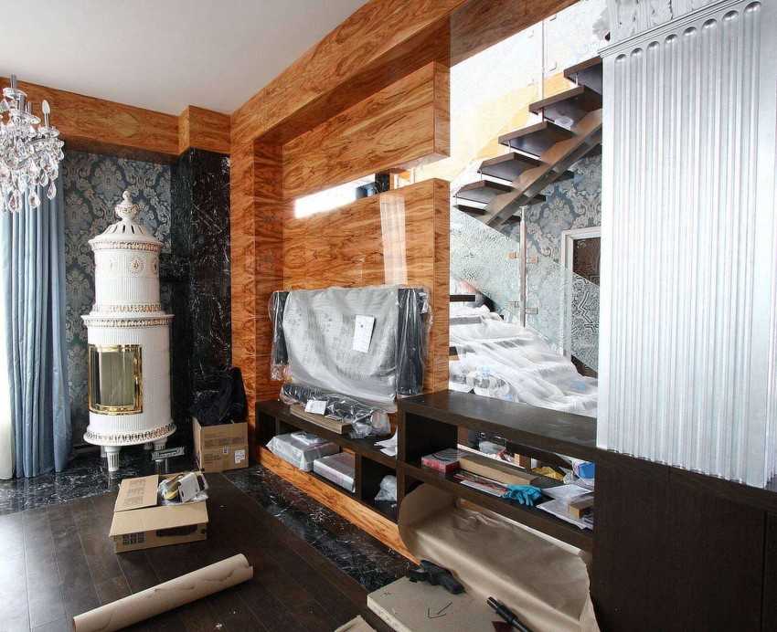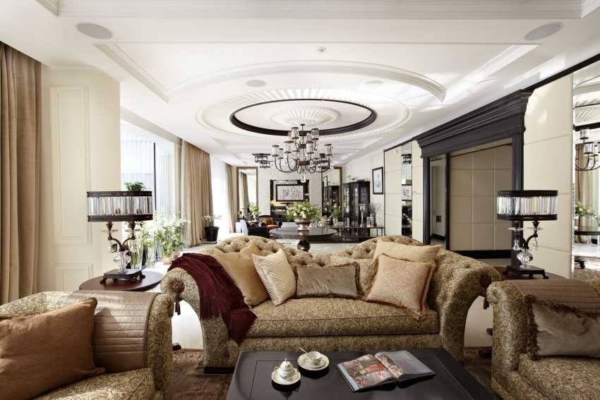 Многие любители классического стиля предпочитают лепной декор гостиной в современном стиле, который всегда был очень популярен. А на сегодняшний день лепные материалы можно заменить полиуретаном, за счет которого можно значительно упростить процесс отделки.
