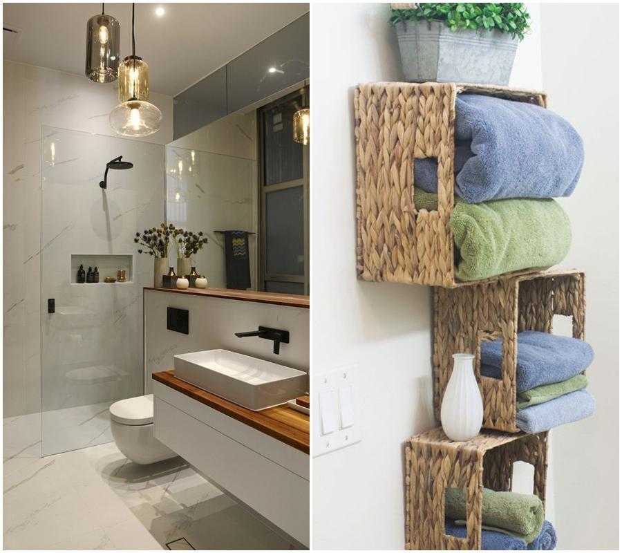 В маленькой ванной комнате нужно как-то хранить полотенца, средства гигиены. Нет места для отдельного шкафа, прикрепите на стену небольшие корзины. К слову сказать, подвесная мебель, как и мебель на ножках, — это хороший прием организации пространства. В маленьких комнатах мебель должна «парить».