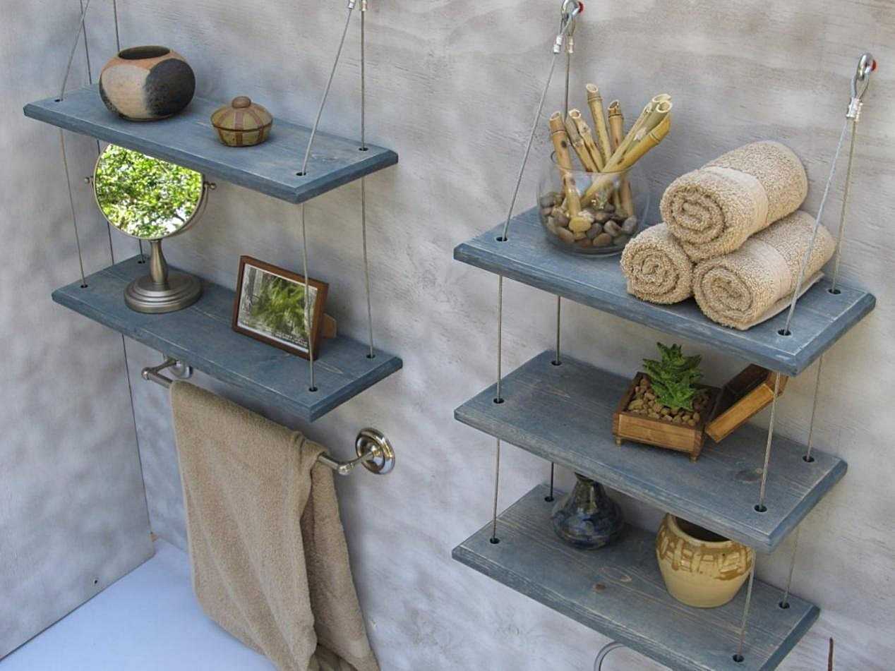 Для хранения порошка, кондиционера, шампуня, геля для душа и прочих средств также требуется организация пространства. Интересная идея с подвесными полками. Они могут быть из дерева, пластика, металла или прочного стекла. Выбирайте, какие вам больше нравятся, но помните, что все прозрачные конструкции делают пространство легче и просторнее.