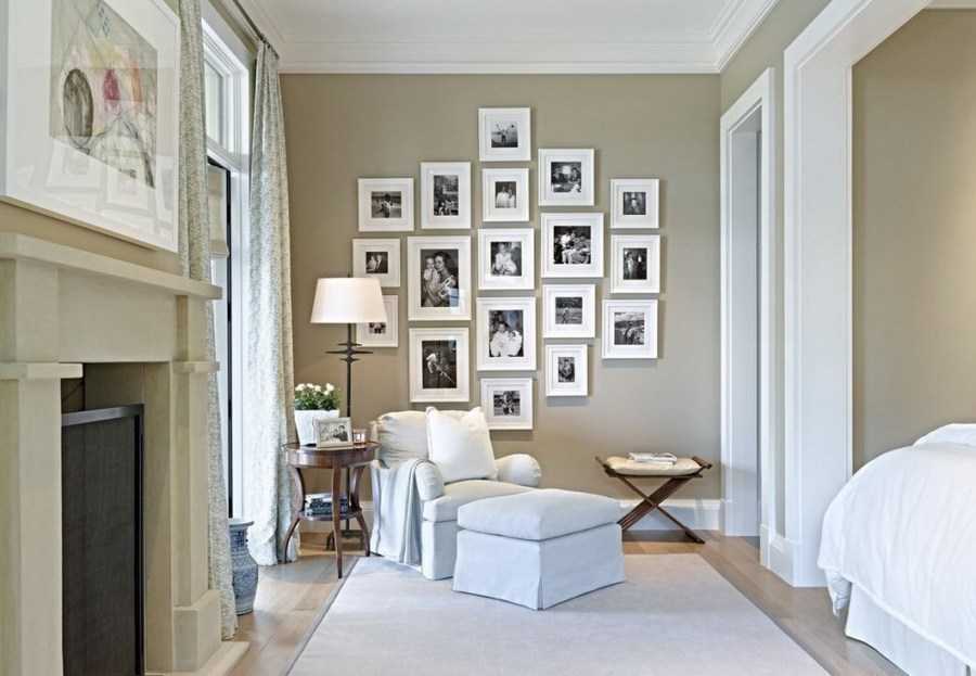 Пространство над изголовьем кровати можно удачно заполнить с помощью панно из картин в контрастных рамах