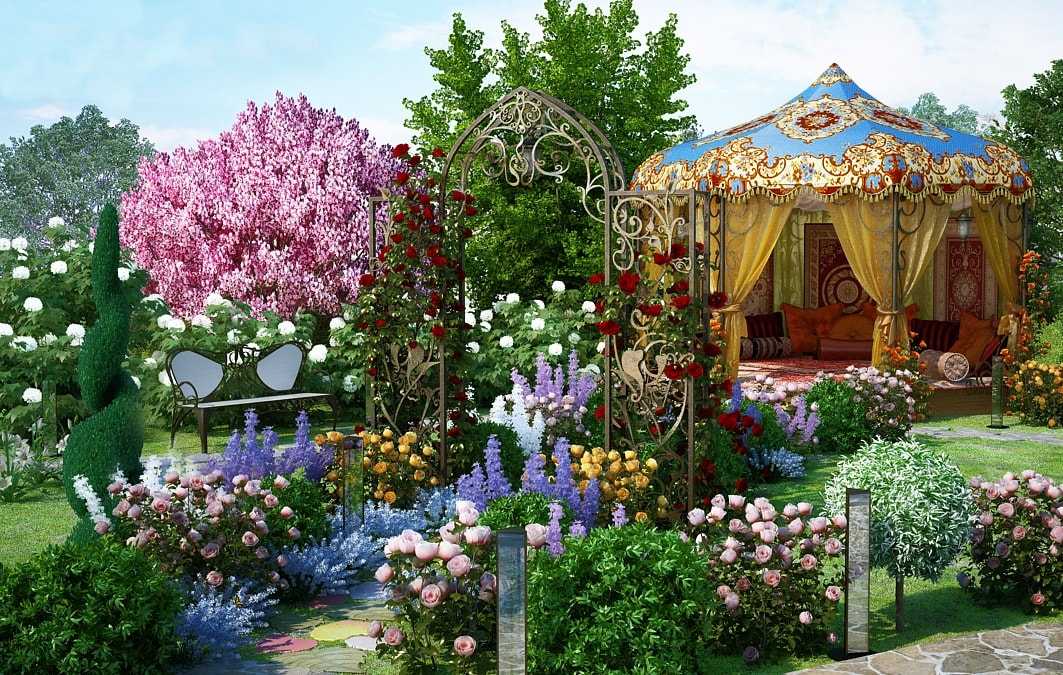 Среди цветов особым уважением в мавританском саду пользуются розы. Настоящий, тщательно спланированный и безупречно ухоженный розарий – один из обязательных элементов стилизованного восточного оазиса. Растения для него подбираются не только по цвету и размерам бутонов, но и по интенсивности и оттенкам ароматов. Не менее любимы здесь и декоративно цветущие луковичные растения. Это традиционные тюльпаны, лилии, цикламены, нарциссы, ирисы и гиацинты. Цветы должны быть максимально крупными и душистыми.