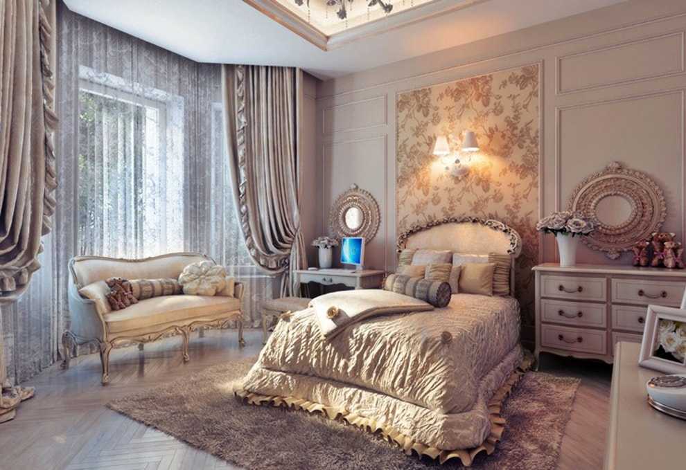 В спальне уместно богато украшенное трюмо, комод или просто большое зеркало в шикарной раме.