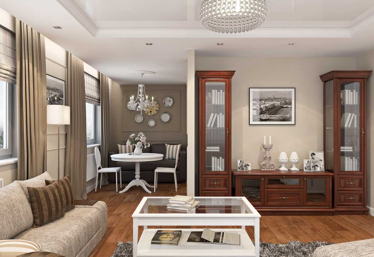Классическая расстановка. В классической кухне-столовой должен быть круглый обеденный стол. Также он послужит границей между зоной готовки и пространством для отдыха и приема пищи. Кухню выстраивают в одну линию. В гостевой зоне будет уместна установка камина, книжных шкафов, можно положить ковер.
