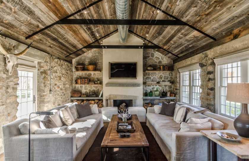 - Природные материалы. Камень, ткань, кожа, металл — все это отлично сочетается с деревом и широко используется в деревенском стиле в интерьере.