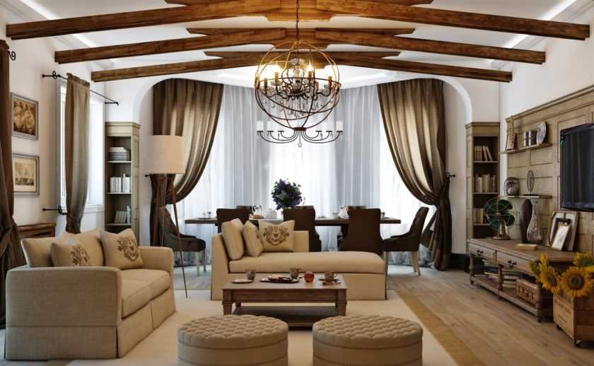 В гостиной в стиле кантри в деревянном доме не скрывают потолочные балки, промежутки между ними красят или белят. Квартиру же оснащают деревянными конструкциями, на которых будет располагаться декор или светильники. На пол кроме досок можно укладывать ламинат или паркет.