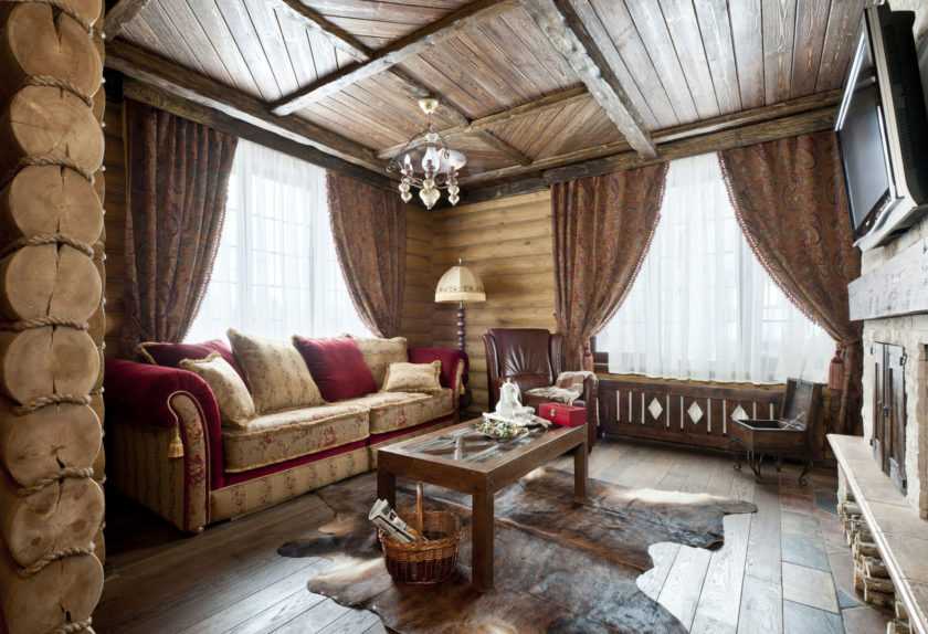 - Натуральное дерево. В каждом стиле свои породы и методы обработки, но оно является главным материалом для оформления стен, пола, потолка, мебели.