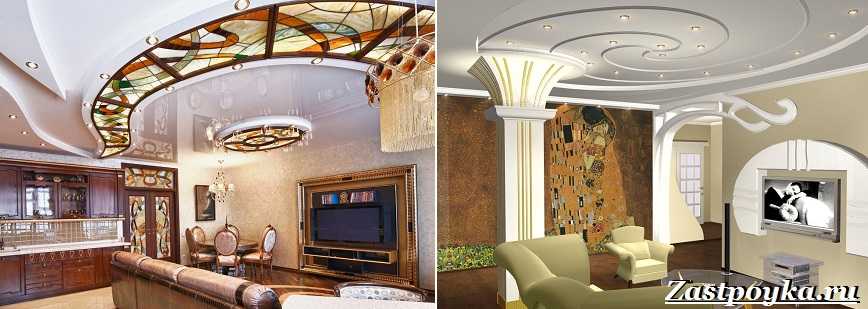 Потолки в стиле модерн имеют несколько уровней. Они прекрасно впишутся в дизайн, если стены будут высокими. Модерн можно узнать по асимметрии, которая приветствуется во всем.