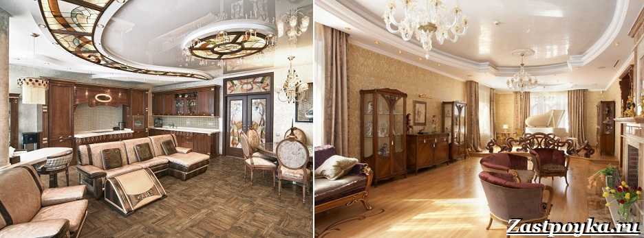 Бывают смелые сочетания черной мебели с белыми стеклами, диванов и кресел самых обычных размеров с одновременной пышностью и объемом форм. В обивке мебели, шторах и обоях должно быть идеальное сочетание.