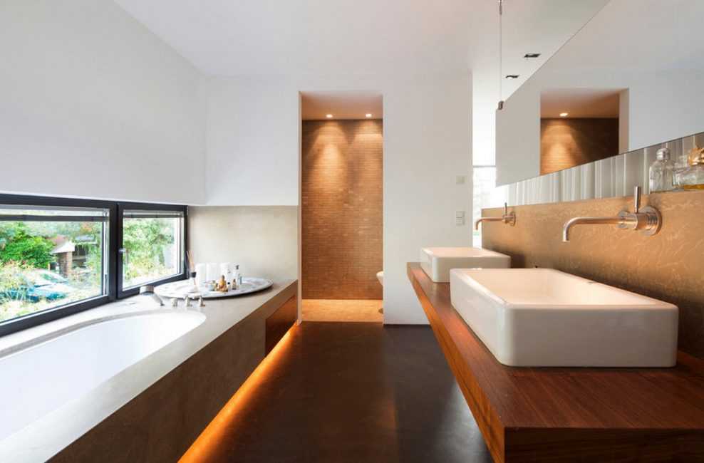 Сантехническая посуда подойдёт современная. Главное избегать футуристической фурнитуры.