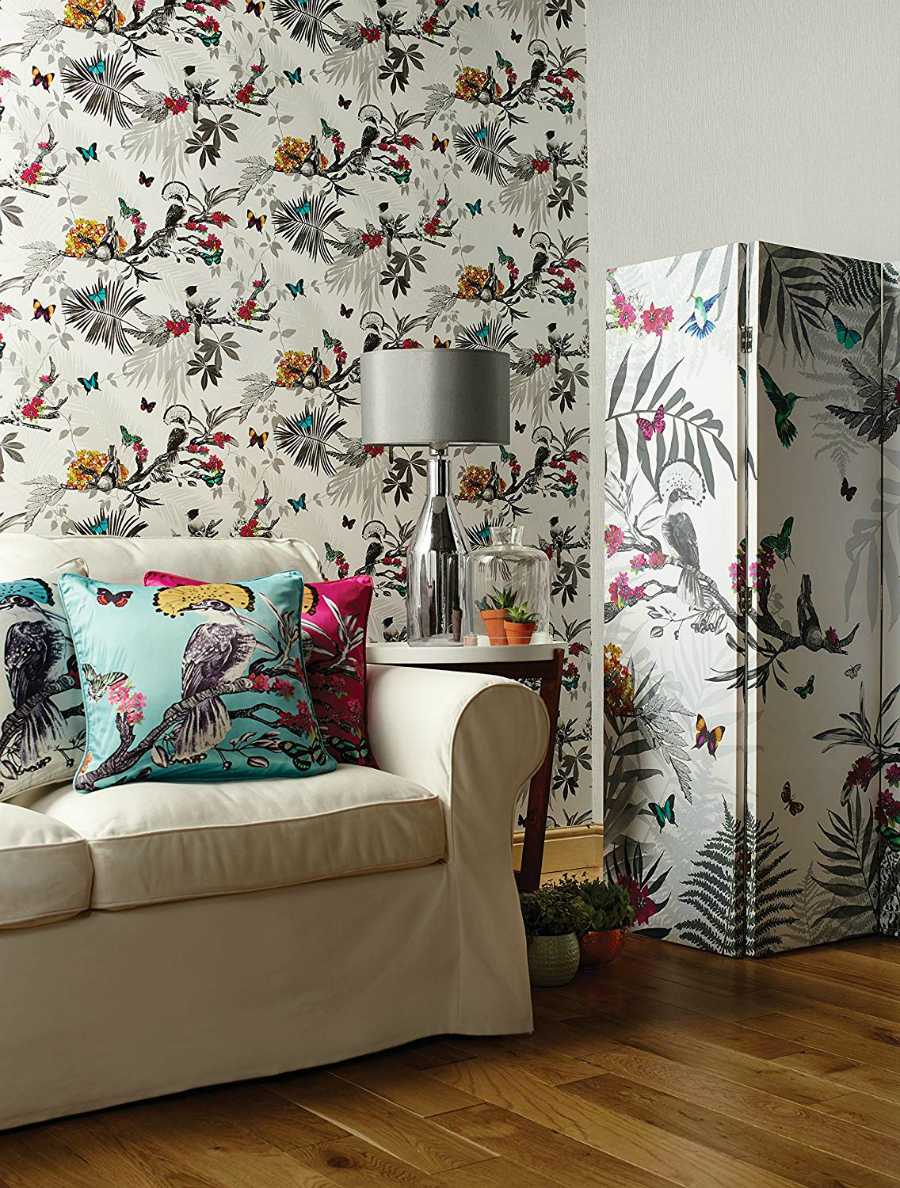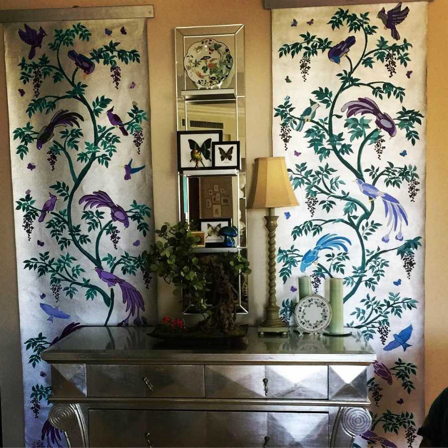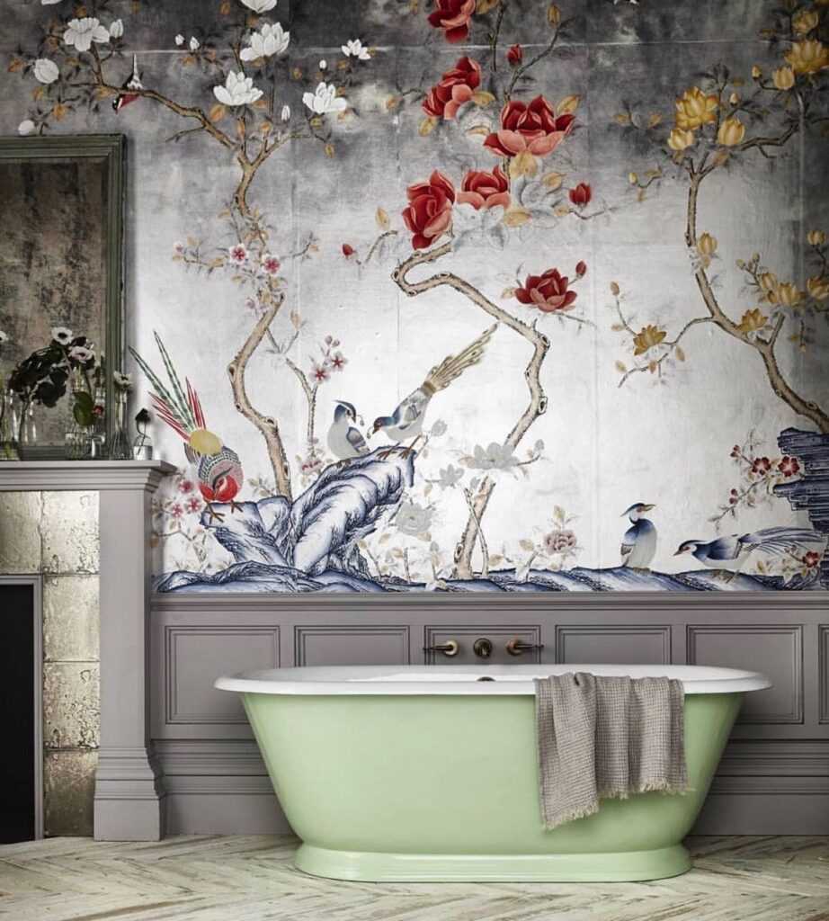 Если ты вдохновишься и решишь сделать все по канонам, в роли обоев должны будут выступить расписные шелковые полотна. Но подойдут и простые обои с принтом, или даже самостоятельная роспись стен, это не сложно, если перерисовывать растения и птиц с детализированных изображений, и вдвойне приятнее. Не обязательно переделывать все стены в доме, достаточно всего одной, она станет изысканным акцентом.