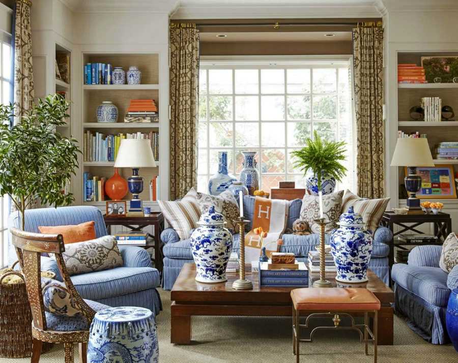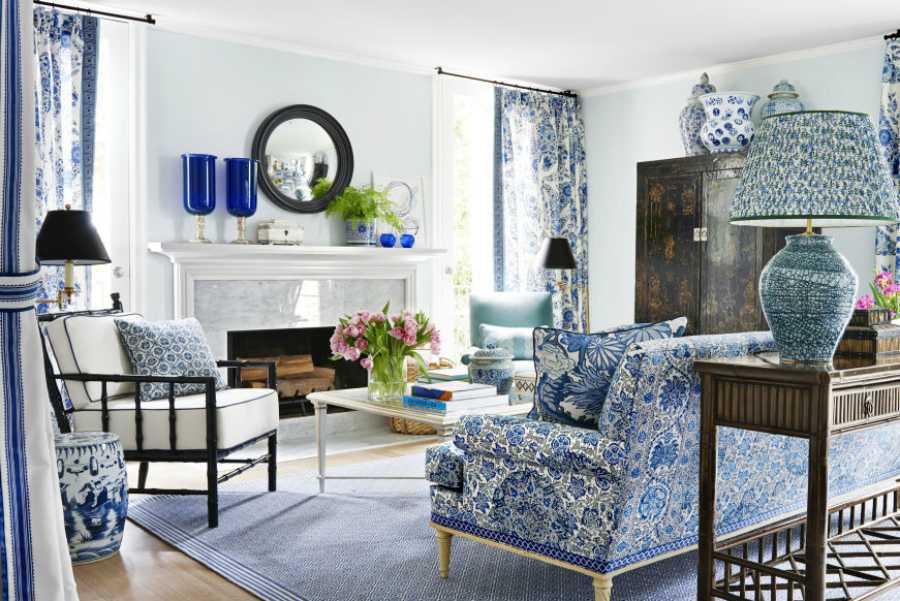 Прекрасно смотрится обивка мягкой мебели в этом стиле. Бело-голубой рисунок, изображающий сад в восточном стиле или повторяющийся цветочный принт, делает такую мебель зрительно легкой, похожей на расписанную китайскую вазу.