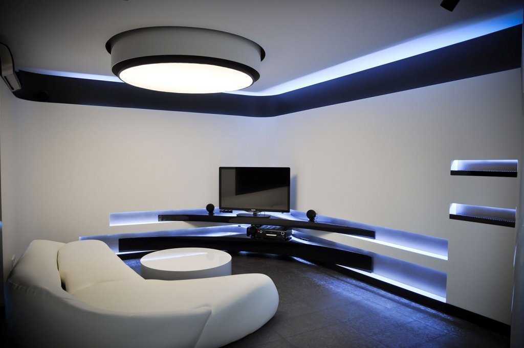 для освещения может использоваться как массивная люстра, так и встроенные источники света