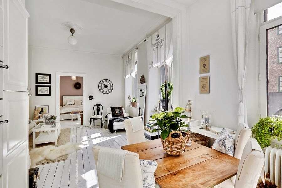 Стены и полы — это фон французского интерьера. Как вы уже знаете, они должны быть яркими, чтобы визуально увеличить пространство. Стоит избавиться от некоторых перегородок и дополнительно уложить тот же материал на пол в соседних комнатах.
