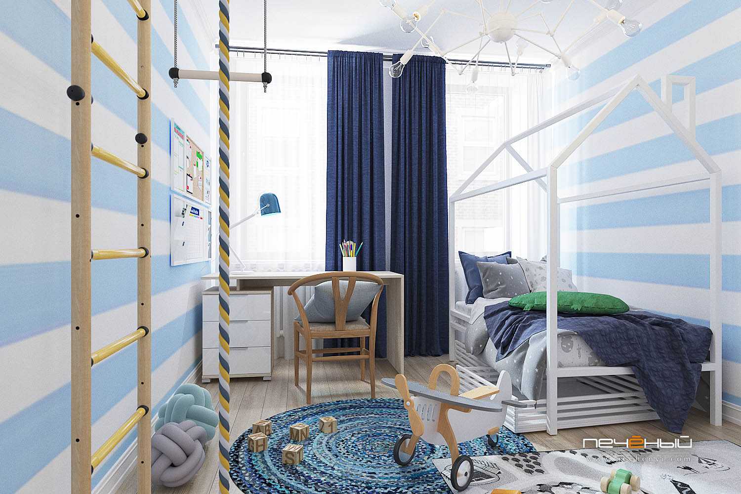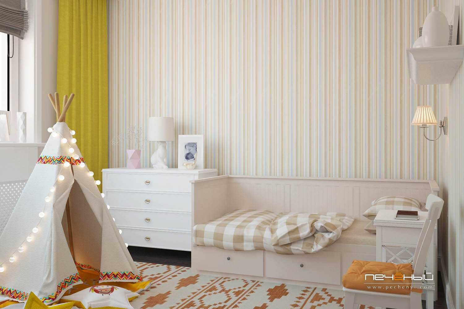 В маленькой квартире редко бывает отдельная детская комната. Но если вам повезло, то её стоит оформить с творческим подходом. Простой, но эффектный способ — это раскрасить стену в полоску.