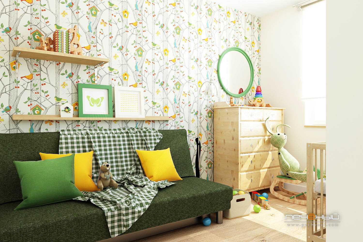 Скандинавский стиль — это не всегда бледные стены. В детских часто используются обои с рисунком. От этого комната становится только уютней.