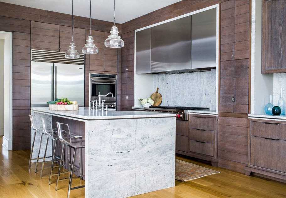 Так как пространства домов обычно большие, от верхнего ряда шкафов можно смело отказаться, выбрав вместо двухъярусной кухни — одноэтажную, но п-образную. Мест для хранения снизу будет достаточно, а над столешницей останется место для открытых полок и красивой посуды.