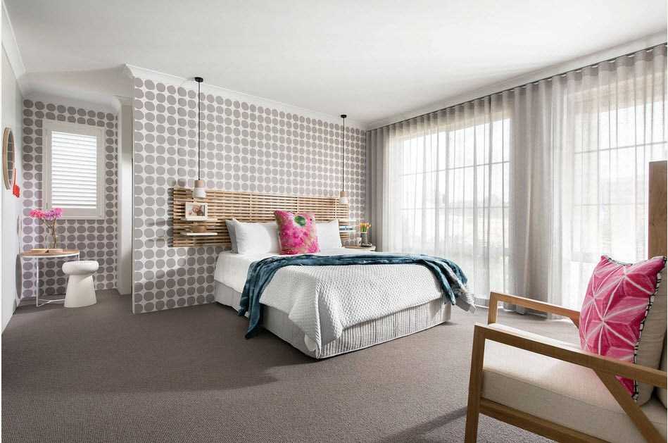 Например, можно отделать нишу, в которой находиться кровать мятными текстурными обоями. На прикроватные тумбы поставить розовые светильники. Но на в коем случае не использовать слишком контрастные агрессивные мотивы.