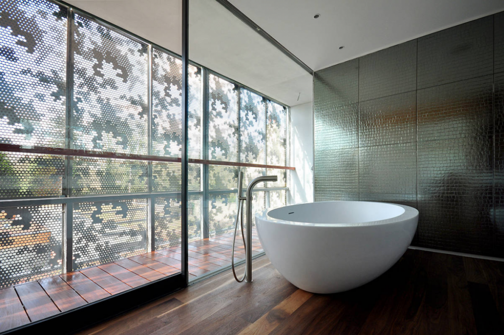 - Необъемные ванны целесообразно устанавливать в просторных комнатах. Для скрытия многочисленных банных принадлежностей от посторонних взглядов экран ванной можно оборудовать встроенной системой хранения с откидными ящиками.