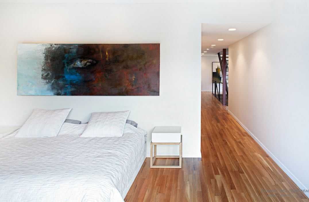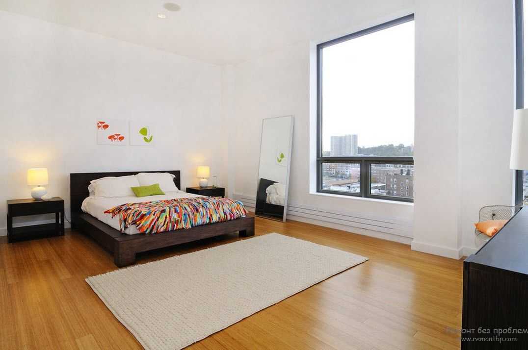 В случае использования деревянного паркета строгой стилистики, разрешается возле кровати постелить мягкий ковролин, но с высоким ворсом. Это и эстетически хорошо выглядит, и приятно, когда босыми ногами ступаешь с кровати.