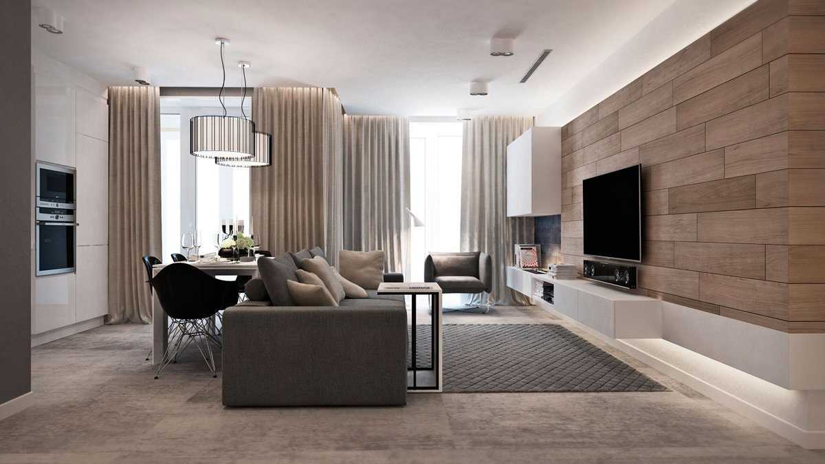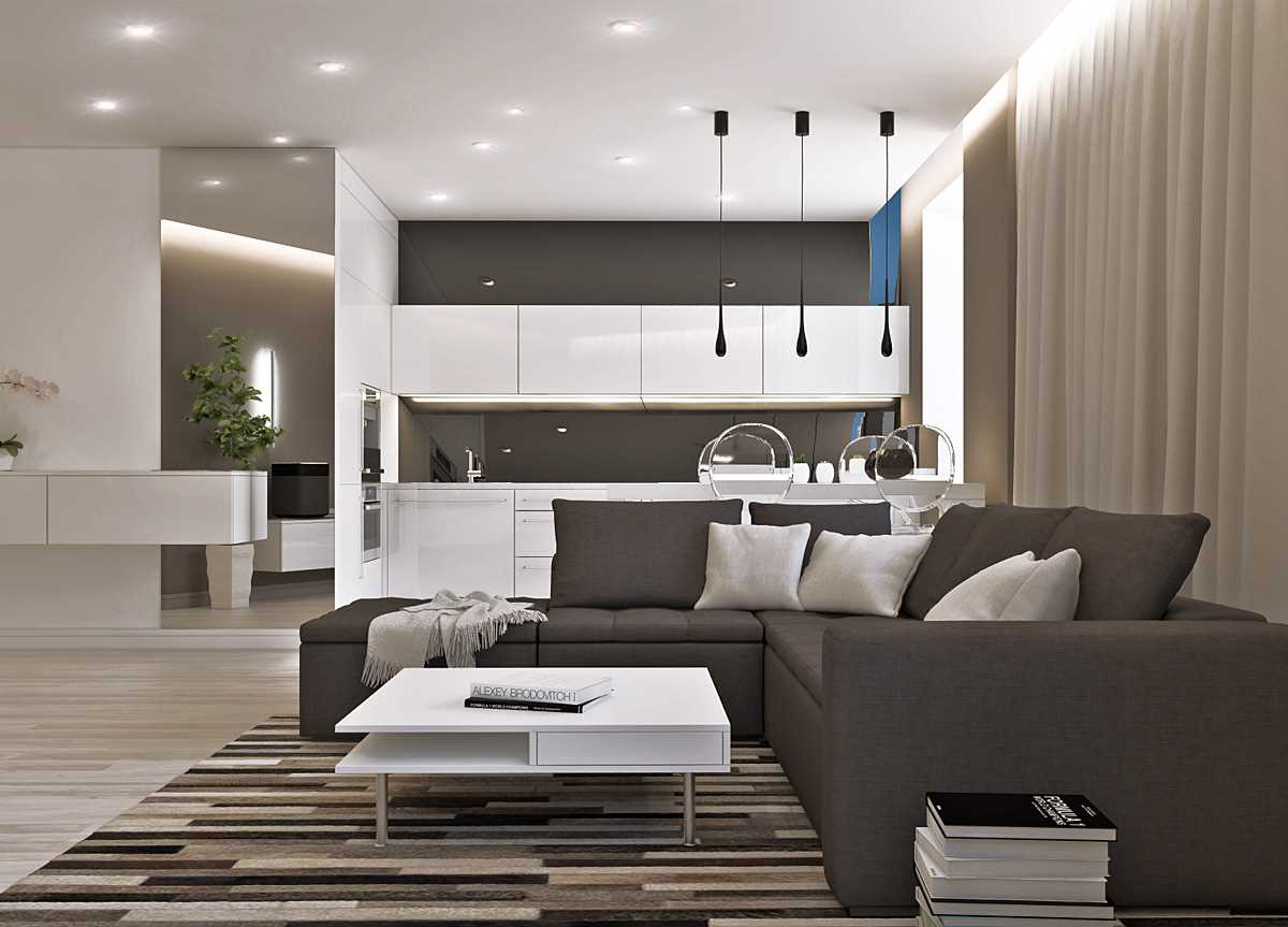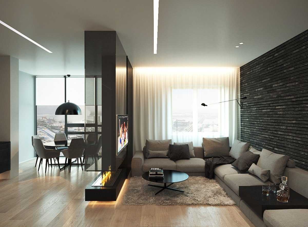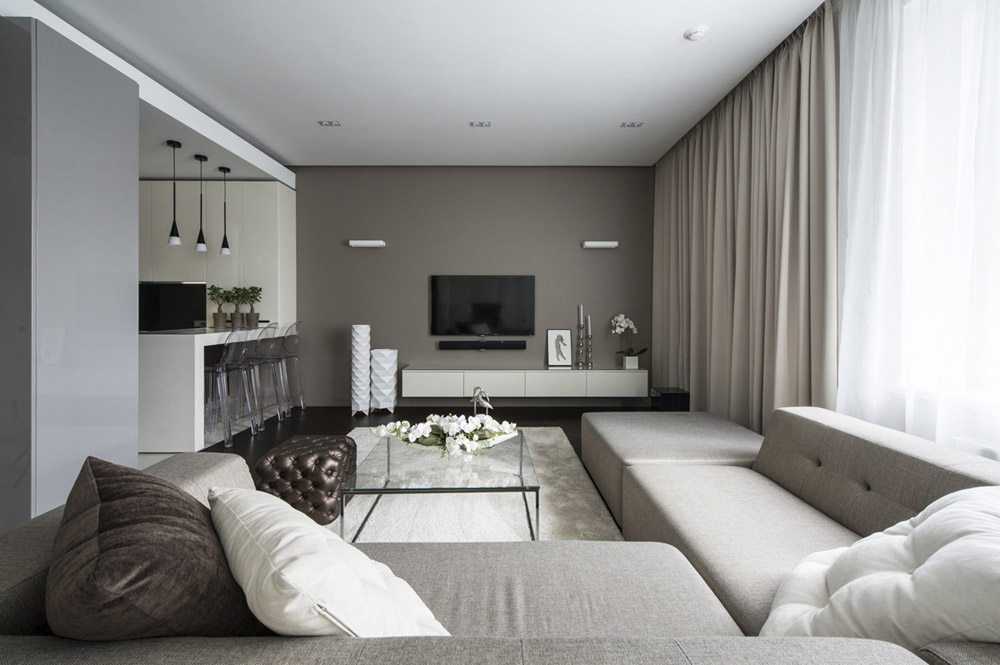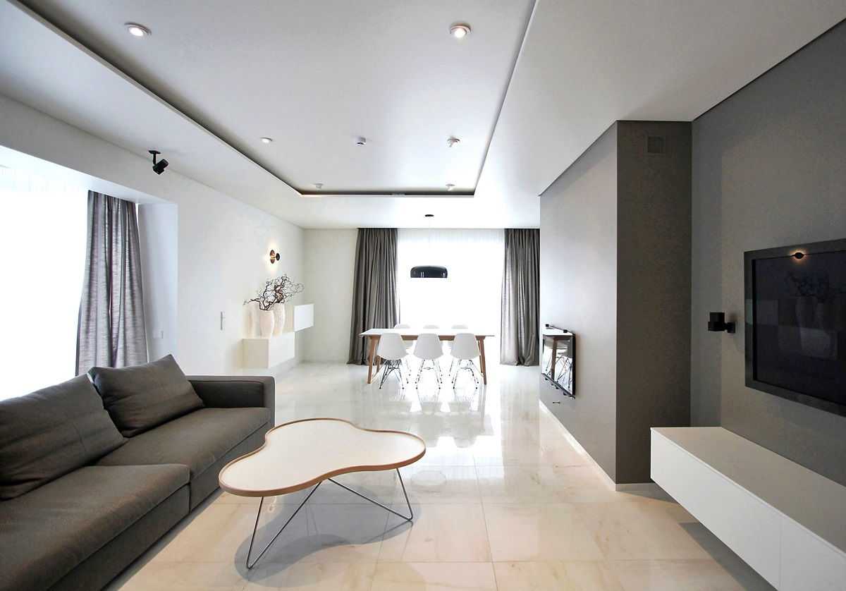 Иногда комнату совмещают со столовой или кухней для увеличения пространства. Мебель в гостиной занимает 20-30% от общей площади помещения, имеет правильную геометрическую форму. Исключается вся декоративная отделка: извитые линии, рисунки, орнамент. Главное при выборе предметов интерьера ‒ это лаконичность, строгость, функциональность. В гостиной в стиле минимализма должно быть достаточно свободного места.
