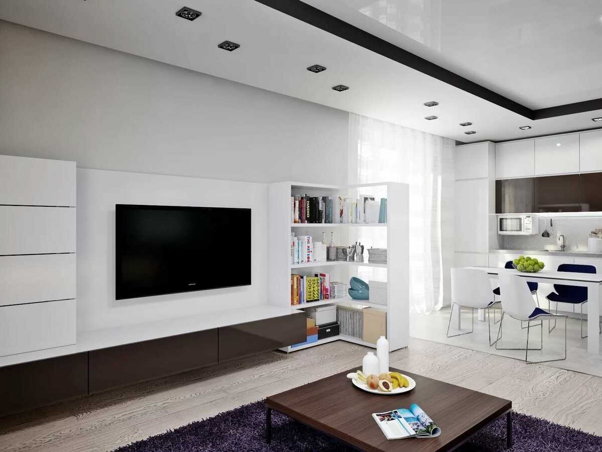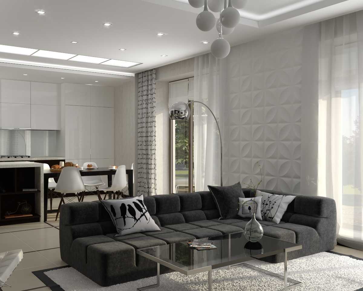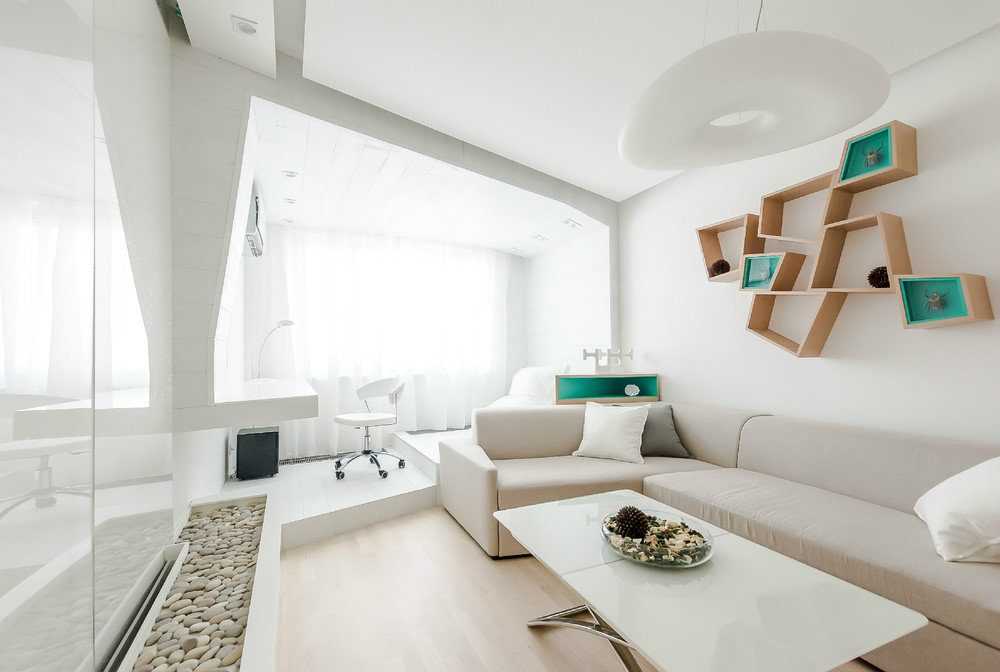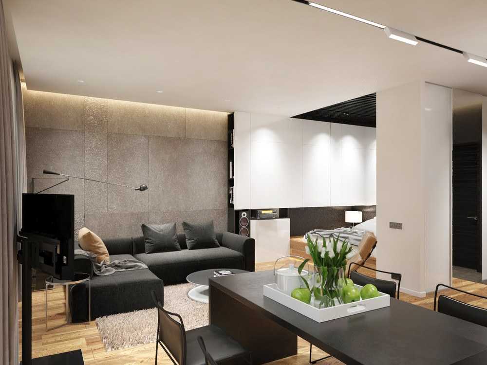 Иногда комнату совмещают со столовой или кухней для увеличения пространства. Мебель в гостиной занимает 20-30% от общей площади помещения, имеет правильную геометрическую форму. Исключается вся декоративная отделка: извитые линии, рисунки, орнамент. Главное при выборе предметов интерьера ‒ это лаконичность, строгость, функциональность. В гостиной в стиле минимализма должно быть достаточно свободного места.