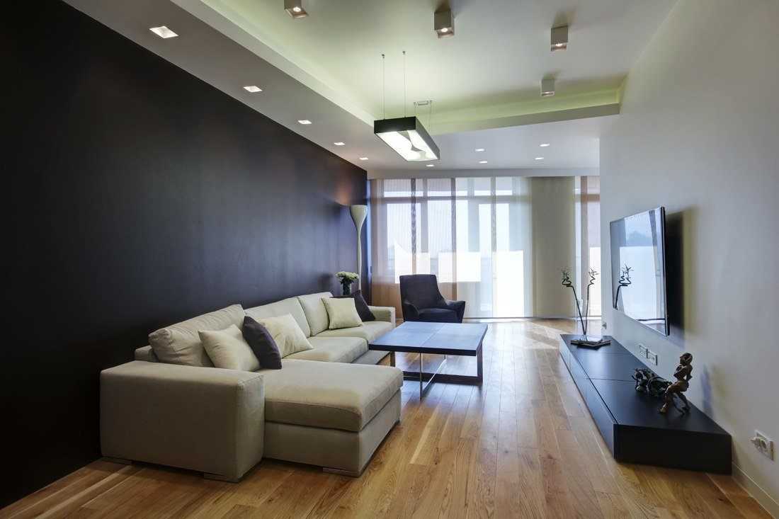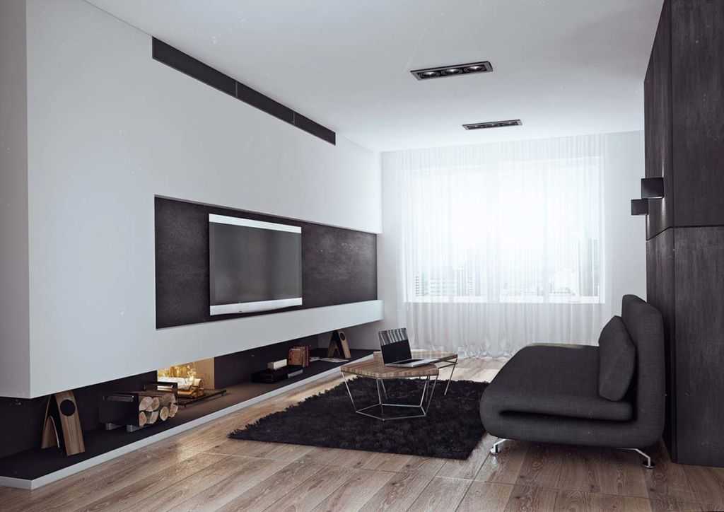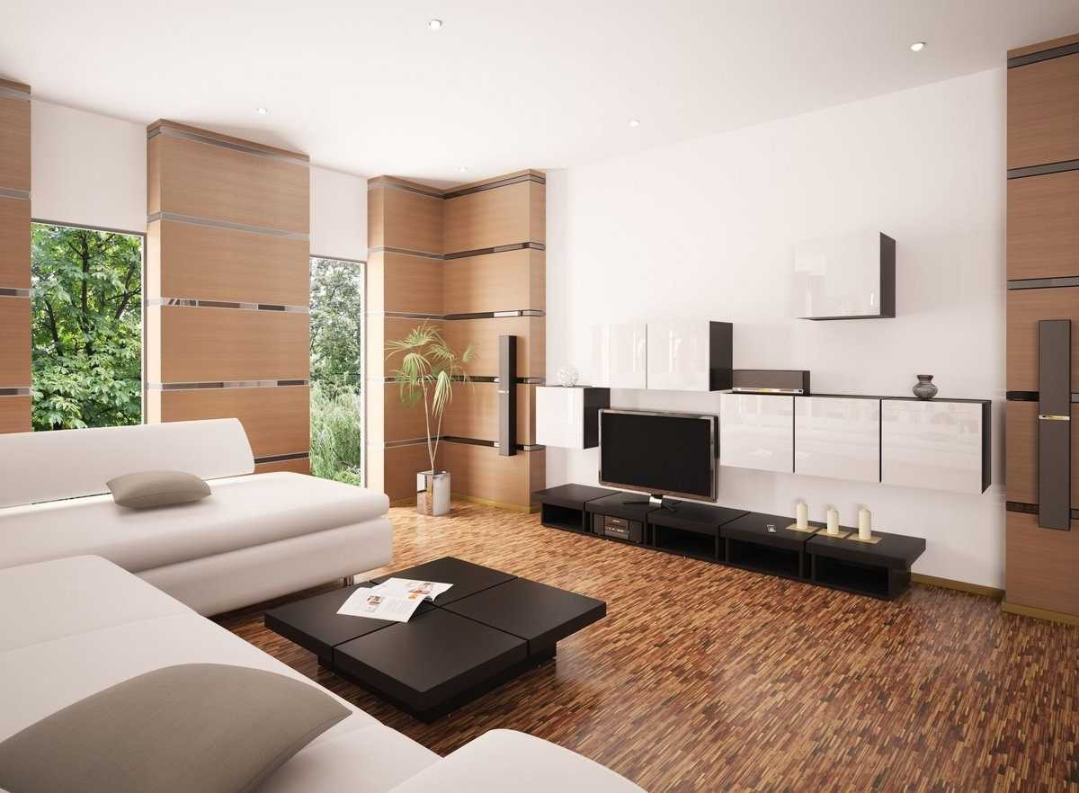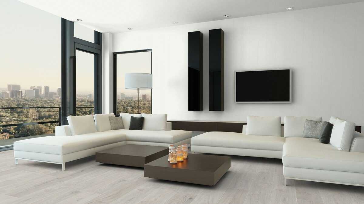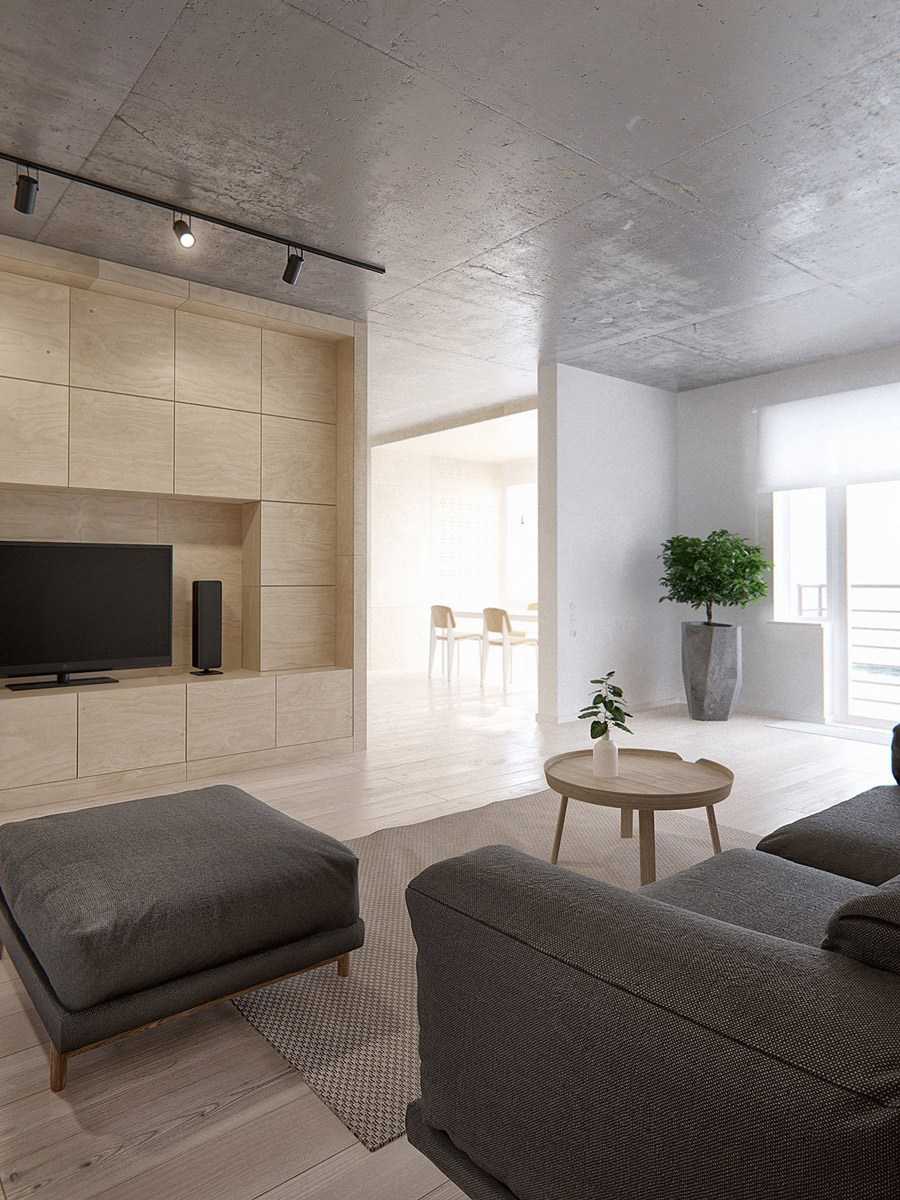 В минималистичной гостиной, даже если она небольших размеров, должен преобладать простор. Такое ощущение создаётся при помощи светлых тонов в отделке и мебели, которые идеально дополнит пол из натуральной древесины.