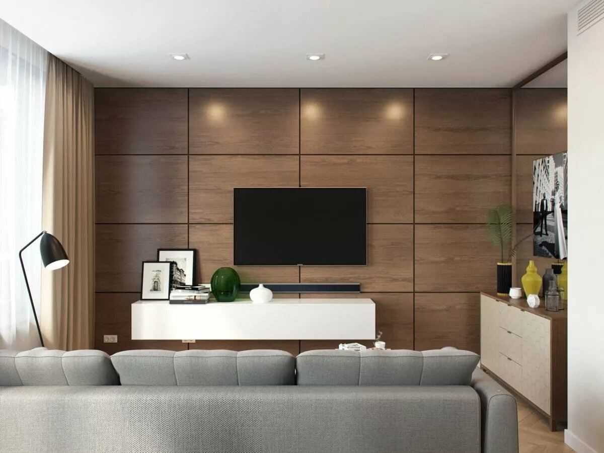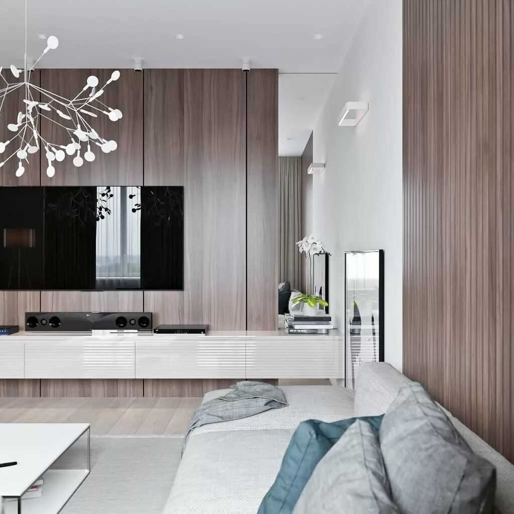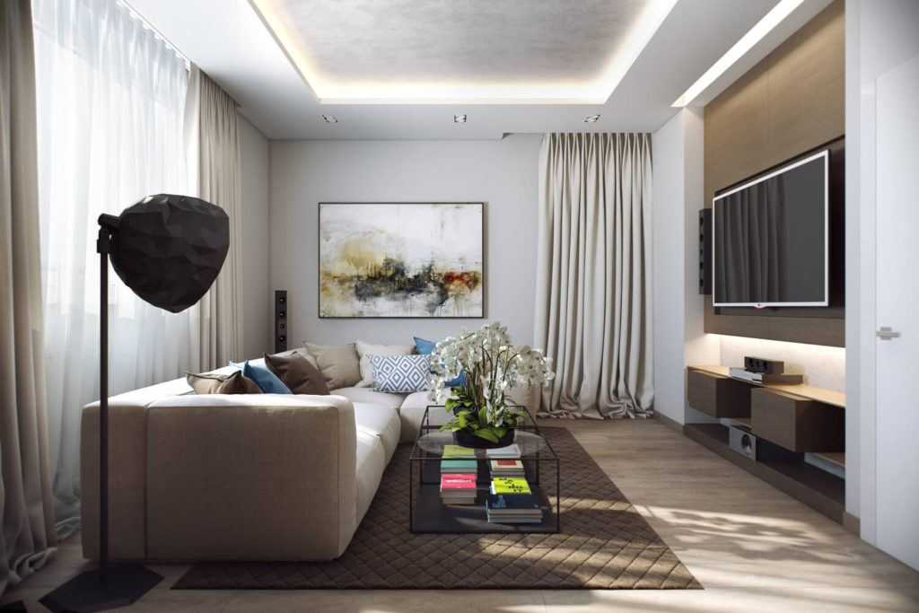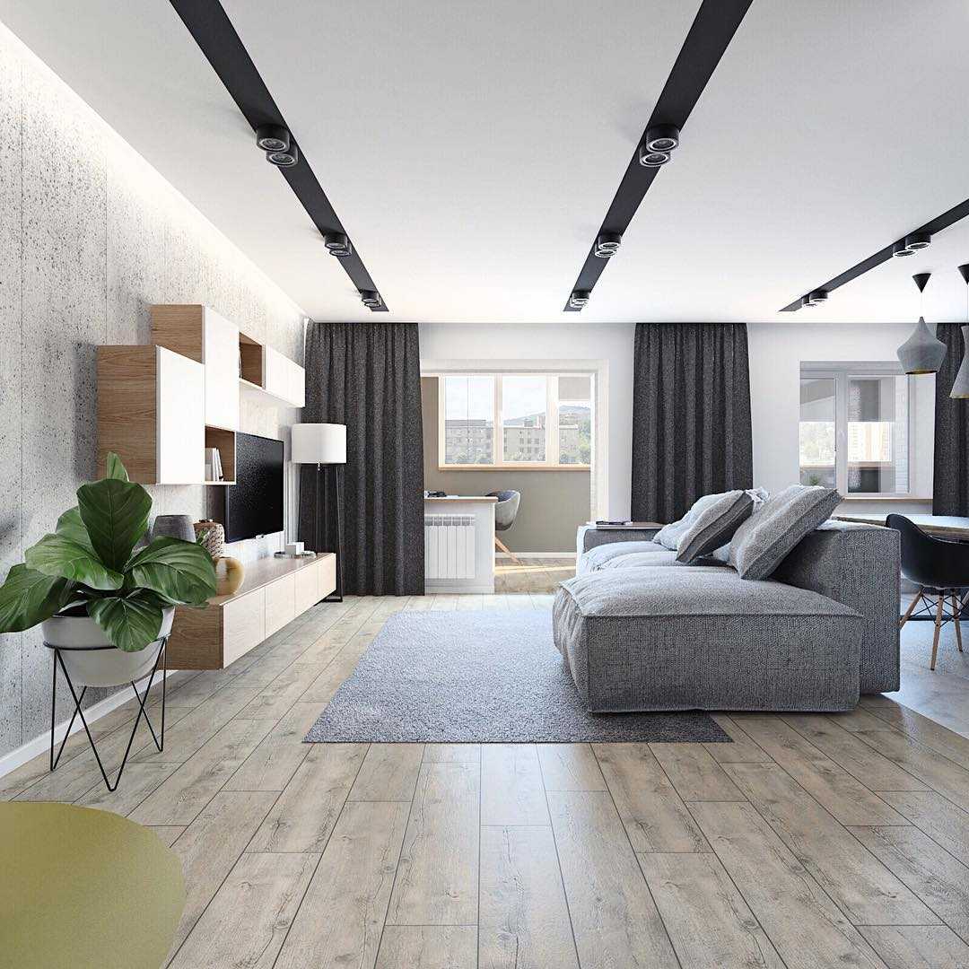 В минималистичной гостиной, даже если она небольших размеров, должен преобладать простор. Такое ощущение создаётся при помощи светлых тонов в отделке и мебели, которые идеально дополнит пол из натуральной древесины.