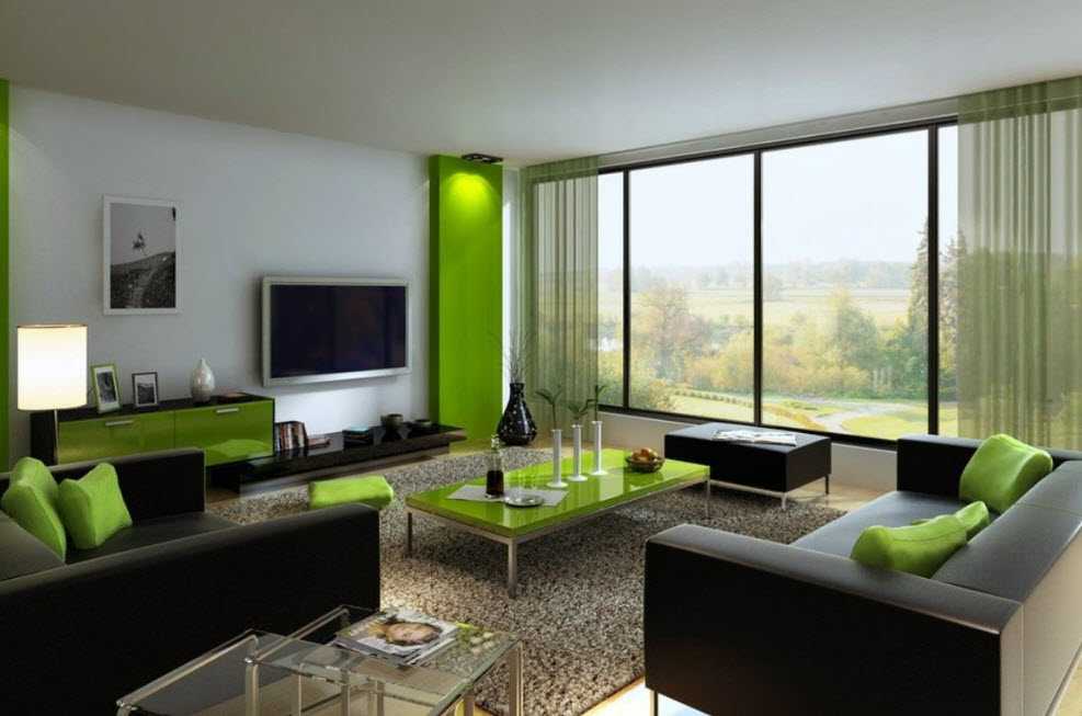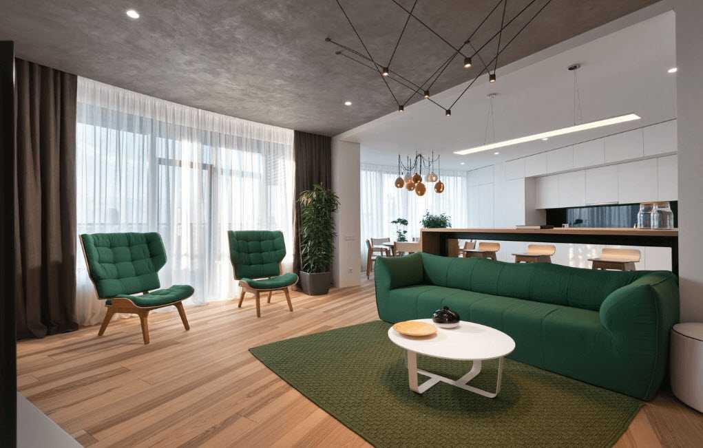 Зеленый цвет – идеальное решение для людей, обожающих все экологически чистое и натуральное. Мягкие тона могут служить основой, а вот яркие травяные оттенки используются для создания акцентов. В качестве декора обязательно используют живые растения, растущие в грубых и простых по своей форме бетонных вазонах, что очень символично.