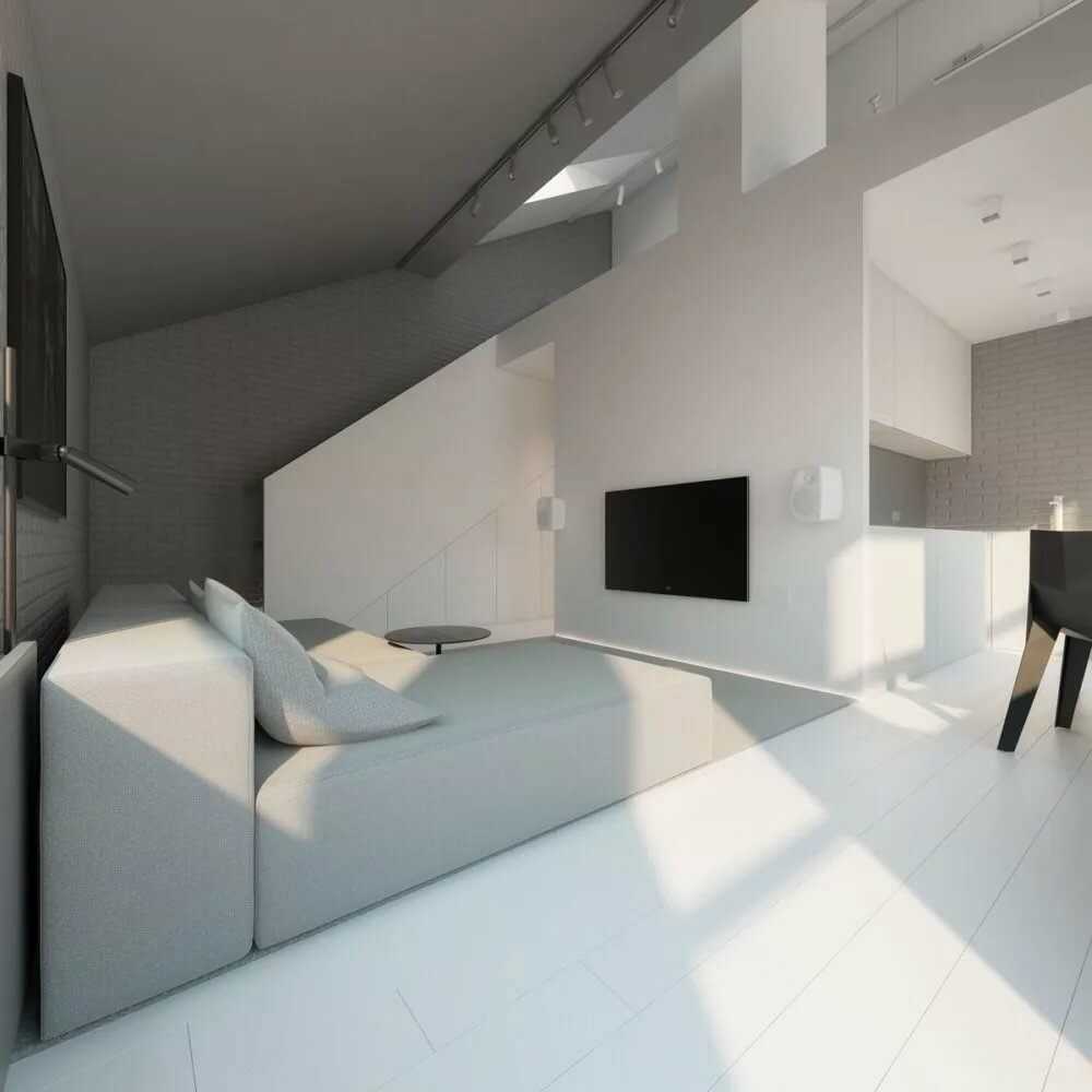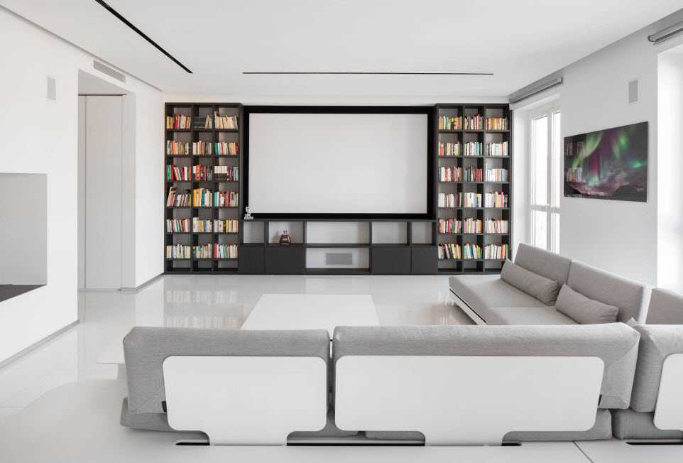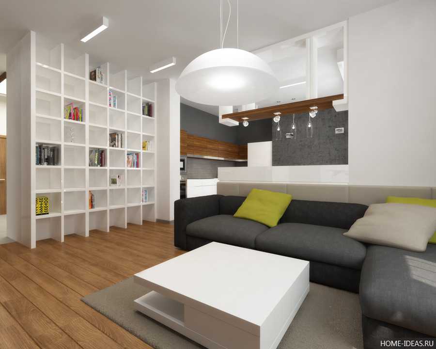 Другой, не менее интересная вариант гостиной в нынче распространенном стиле минимализм – белоснежные стены, серые перегородки и диван в цвет.