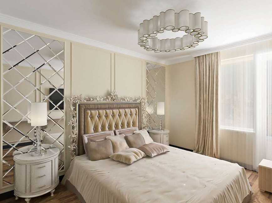 Идея интерьера неоклассика – сделать зеркальную отделку стен с флористическими узорами. Одно большое зеркало в позолоченной оправе добавит воздушности помещению, расширит комнату. Мраморные полы или отделка стен из натурального камня преобразят спальню.