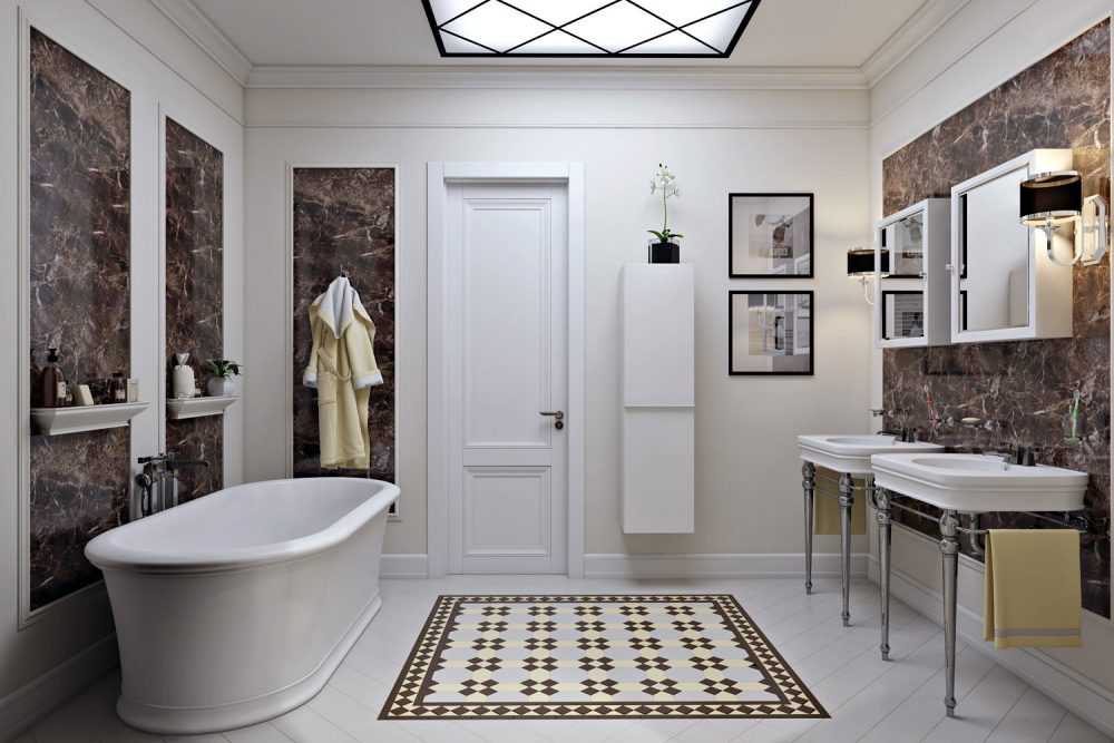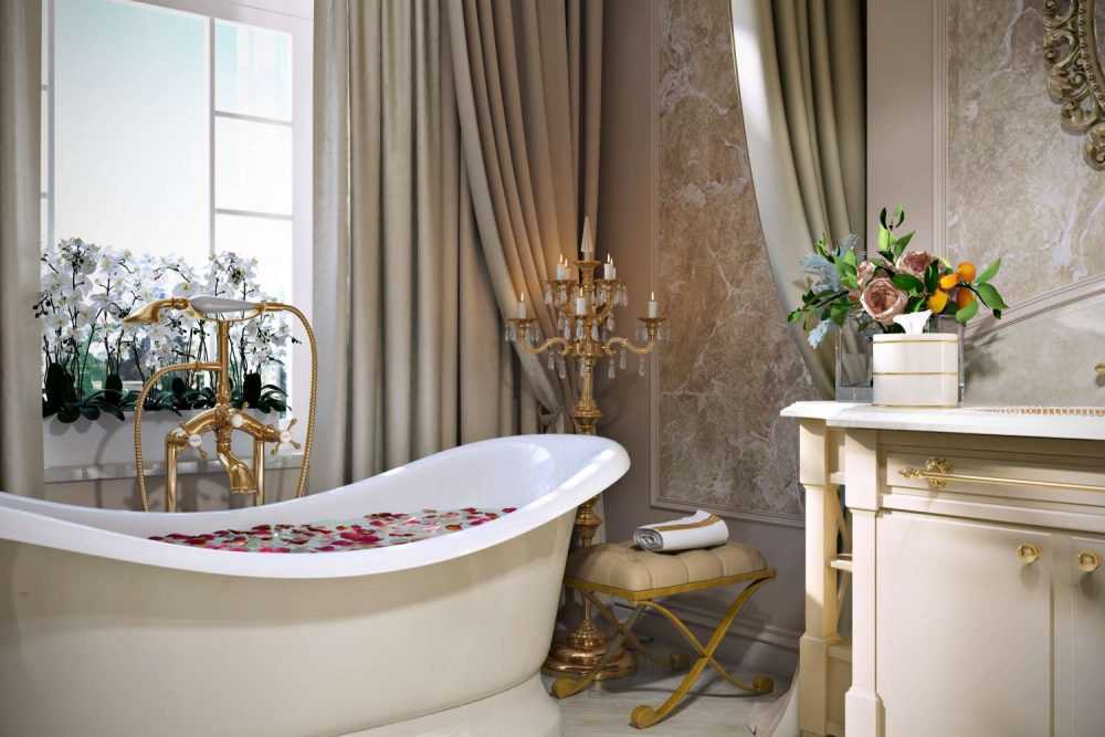 Независимо от площади ванной комнаты, в ней легко удается организовать неоклассический дизайн. С помощью элементов декора легко дополнить комнату так, чтобы она соответствовала своему назначению.