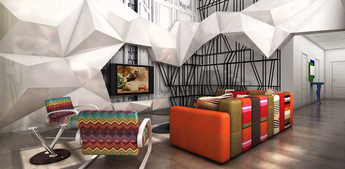 Обычно в креативном интерьере первостепенный смысл возложен на стены. Традиционно применяют два решения: белым либо холодным серым цветом создают фон для размещения акцентов цвета – постеров, фотографий, коллажей и пр. В данном случае сочетания на контрасте только приветствуются, цвета градиентом могут «перетекать» один в другой. Органично вписываются в концепцию всевозможные узоры в виде полос, гороха, геометрических фигур. Одну из стен можно выполнить в технике цикличности, с многократным повторением одного элемента.