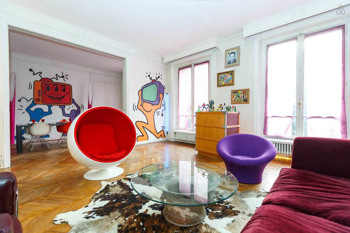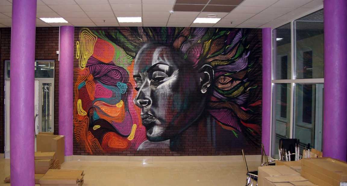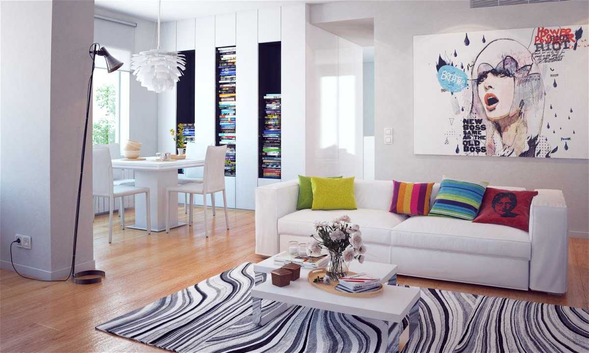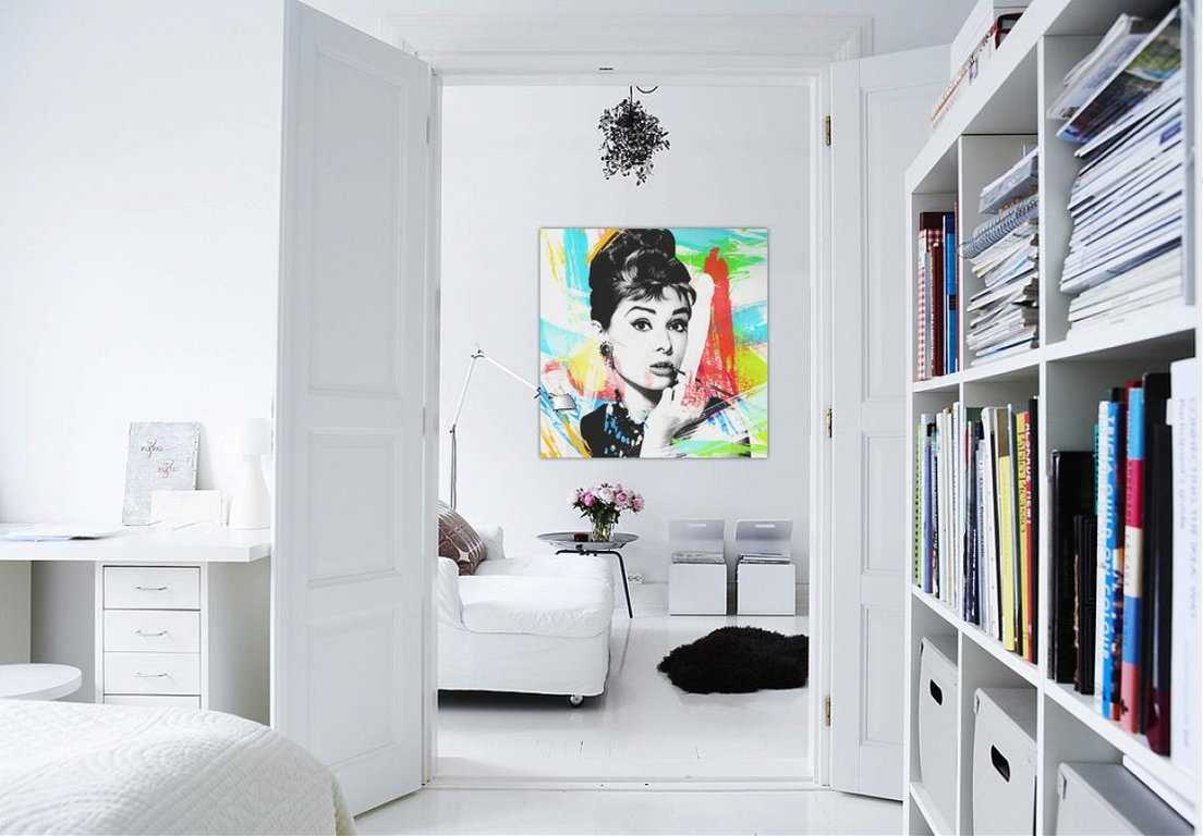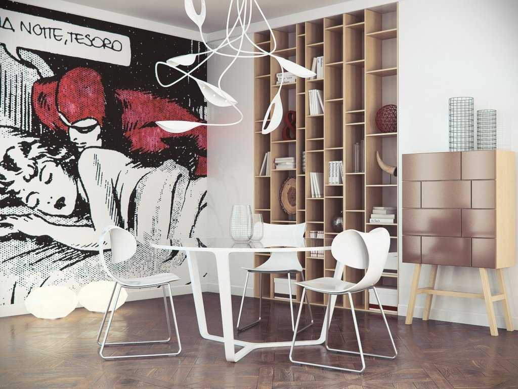 Не стоит пытаться логично выстраивать цветовые сочетания в поп-арте. В одном помещении может соседствовать беж и кислотные цвета. Единственная гармония, присутствующая в поп-арте, кроется в исходном белом фоне для контрастной передачи основных ярких декоративных элементов. Сочность обстановке придают граффити во всю стену либо установка широкоформатных баннеров.