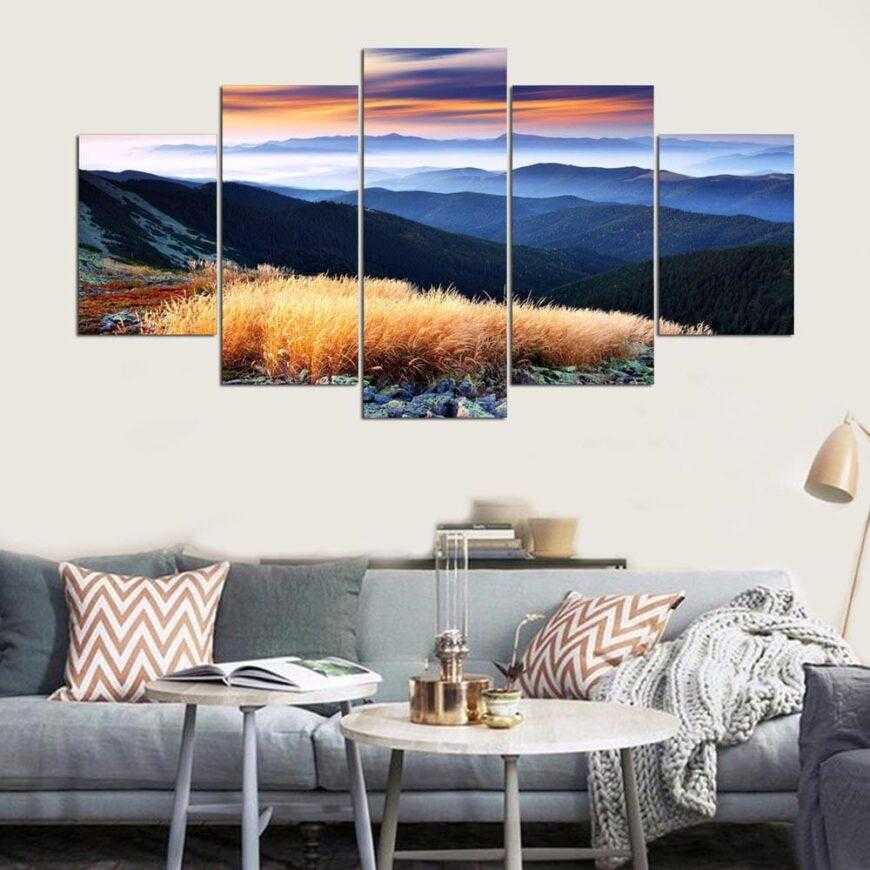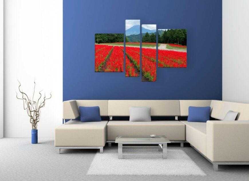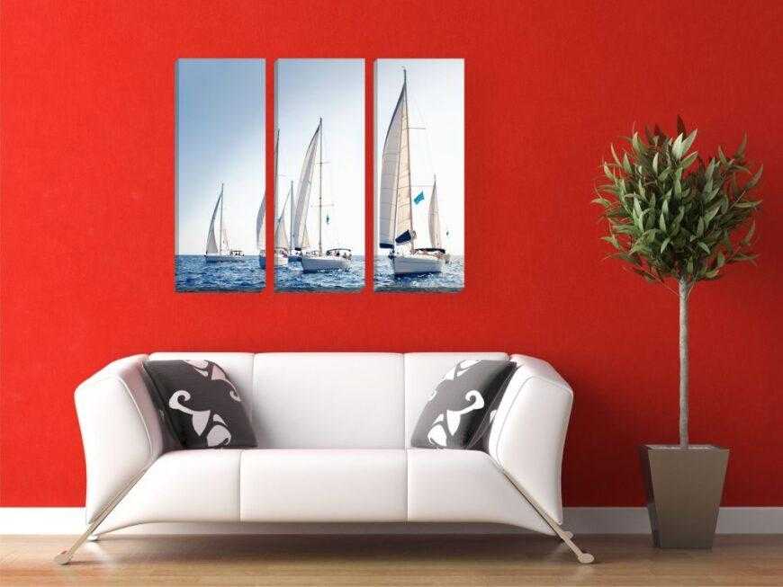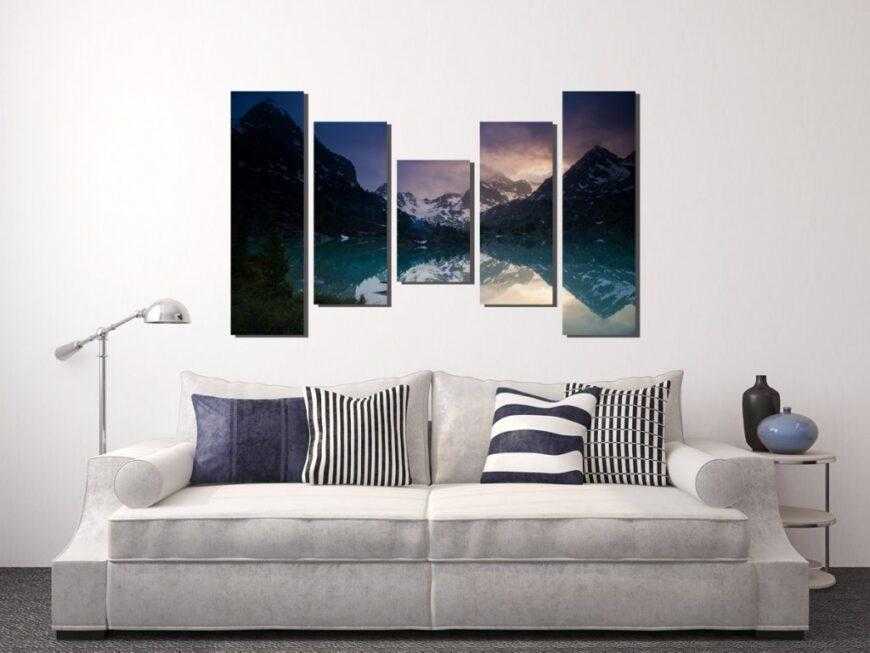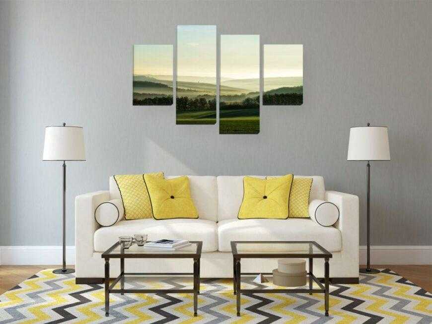 соблюдение строгой симметричности. Примером может служить комбинация из двух вертикальных полотен по центру и прямоугольными изображениями с двух сторон. Полотна равных размеров хорошо размещать в несколько рядов