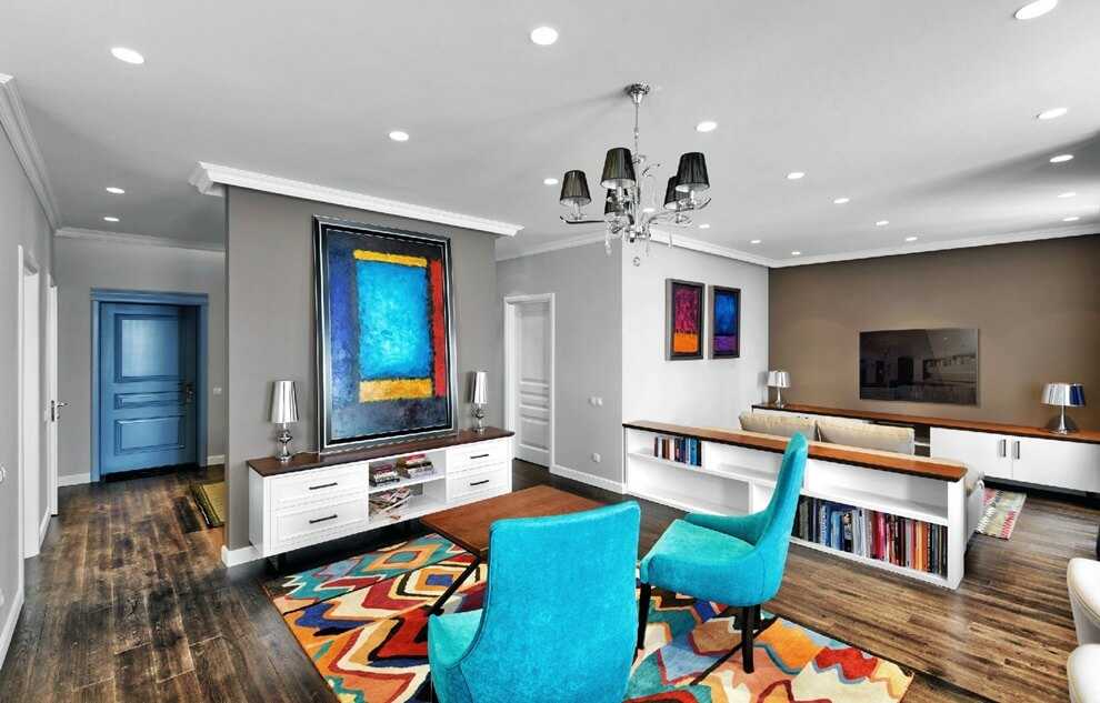 Основные цвета должны занимать лидирующие позиции: их применяют в отделке стен, пола и потолка, выбирают для мебели, текстиля, штор. Акцентный цвет – замечательное решение для мелких деталей: узора на обоях, ковре, принта на шторах. Кроме того, подобный цвет поможет зонировать пространство.