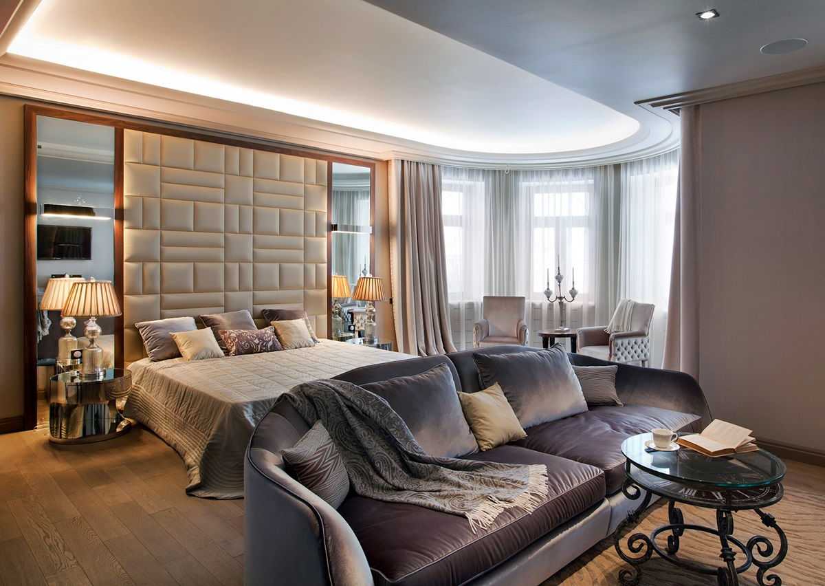 Очень часто дизайнеры интерьера предлагают сделать одну стену акцентной, как правило, это стена над изголовьем кровати. Ее можно сделать более яркой, обустроить в ней нишу или же задрапировать тяжелой дорогой тканью. Хорошей идеей будет и подсветка в этой зоне.