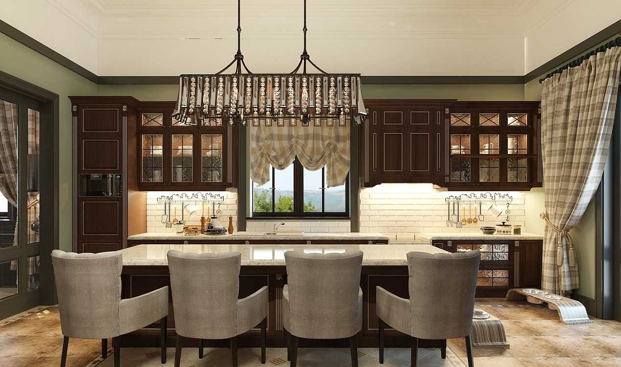 Удачным стилистическим ходом будет устройство камина или его имитации. В качестве узоров для отделочных материалов и текстиля хорошо подойдут геральдические мотивы, клетка, полоска, розы. Всю бытовую технику по возможности нужно встроить в гарнитур таким образом, чтоб она не бросалась в глаза.