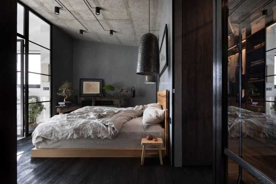 Некоторая незавершенность в интерьере выражается в неприбранной кровати. На первый взгляд небрежно брошенное покрывало, на самом деле уложено продуманными складками.