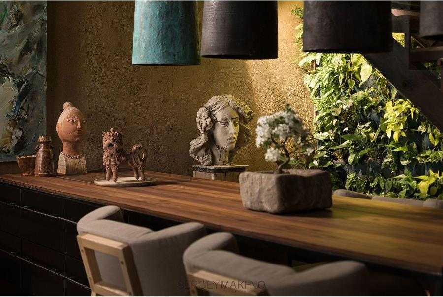 Отсутствие орнаментов и узоров с лихвой заменяется вниманием к фактуре. Разноцветные прожилки древесины, оттенки природного камня – неброская и благородная красота