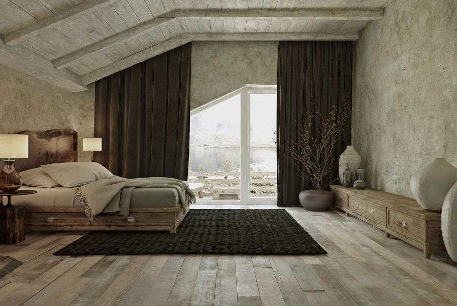 Стены в таких комнатах будут иметь простую, можно сказать монастырскую отделку. Это может быть грубая штукатурка, но с плавными линиями углов. Основную палитру должны составлять цвета бежевых, дымчатых и коричневых оттенков. Стена может быть просто фактурным бетоном, отделана камнем или штукатуркой с рисунком. Если предметы сделаны из дерева, то его можно искусственно состарить и покрыть матовым лаком.