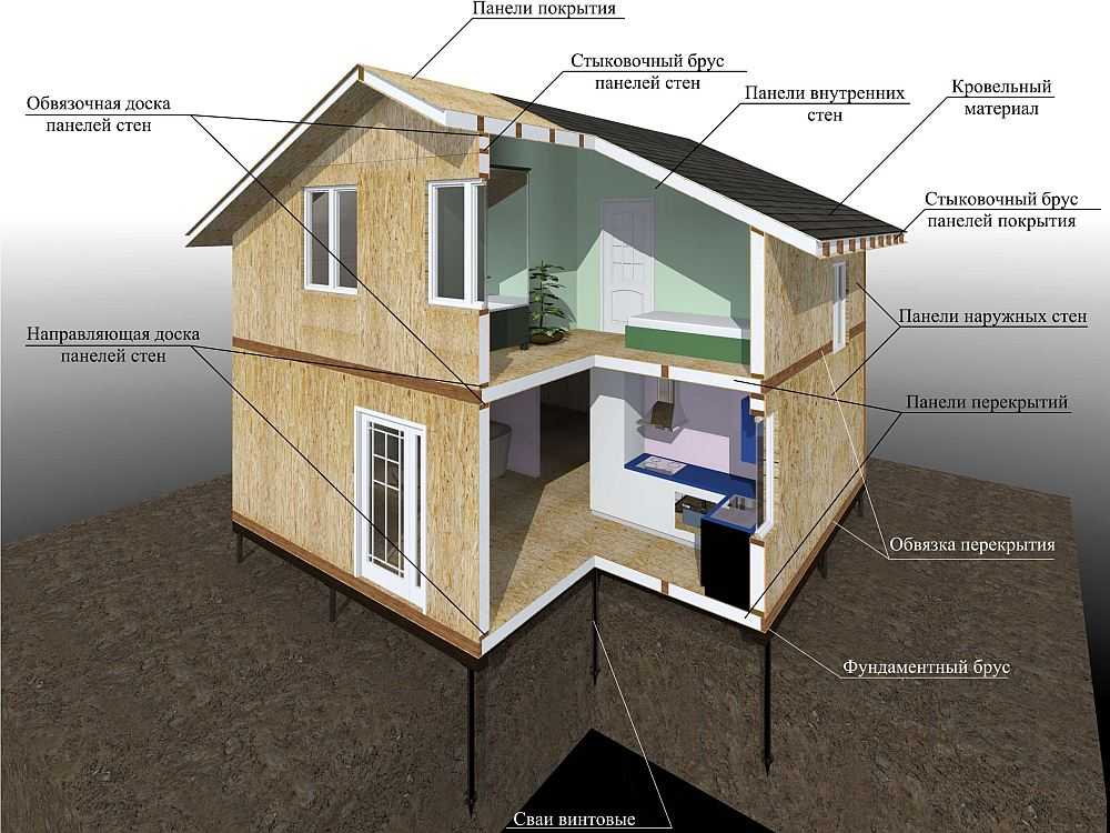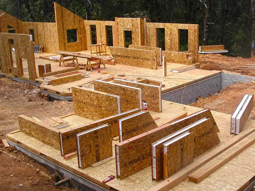 Стропила хранят только в вертикальном положении. Собственно монтаж начинается с укладки пола. Панели соединяют пазо-шипными соединениями с запениванием, а если пазов нет – саморезами. После проверки точности разметки собирается нижняя обвязка, закрепляемая анкерами, и от угла устанавливаются стеновые панели – сначала наружные, и лишь после сборки внешних стен переходят к внутренним перегородкам.