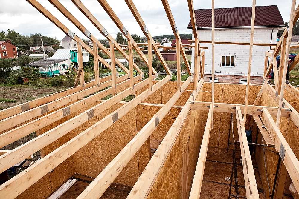 Монтаж панелей крыши. После установки фронтонных панелей их торцы зашивают специальными брусьями, после чего устанавливают панели крыши и уплотняют их стыки. Для закрепления панелей с коньковыми брусьями и опорными балками используют саморезы, а также клей.