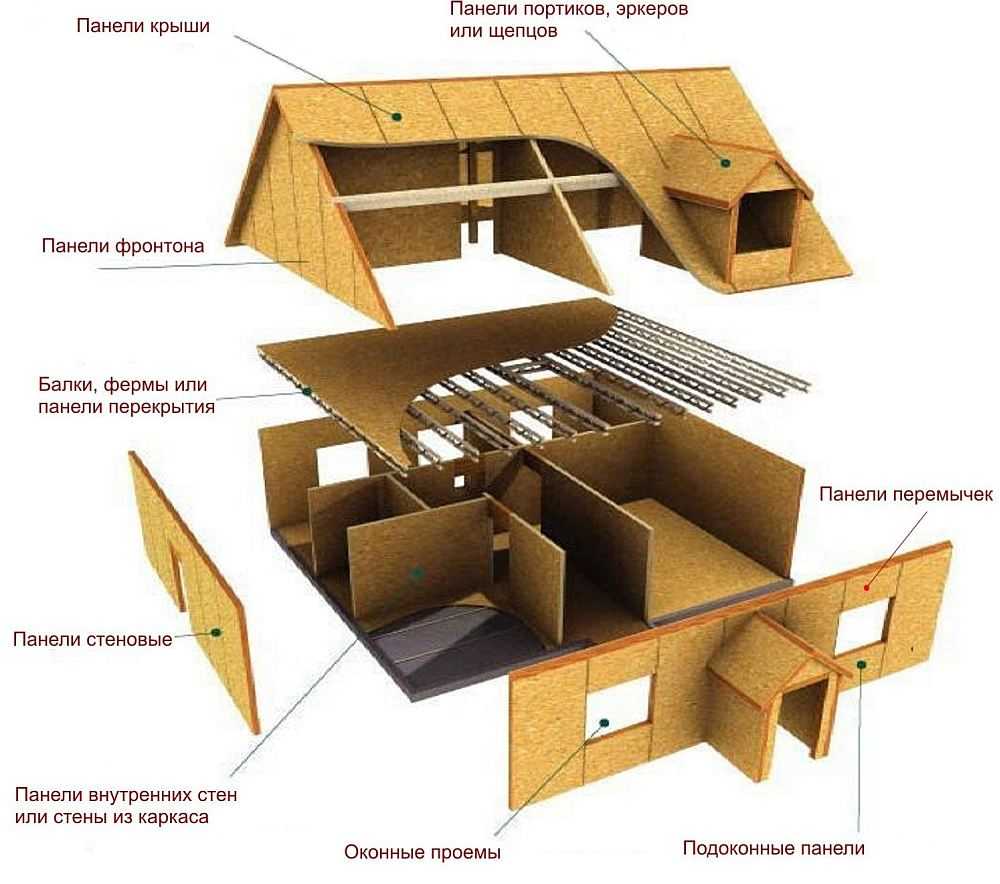 Комплект каркасного дома с завода включает в себя определенное количество обязательных элементов. Его составляющими являются: