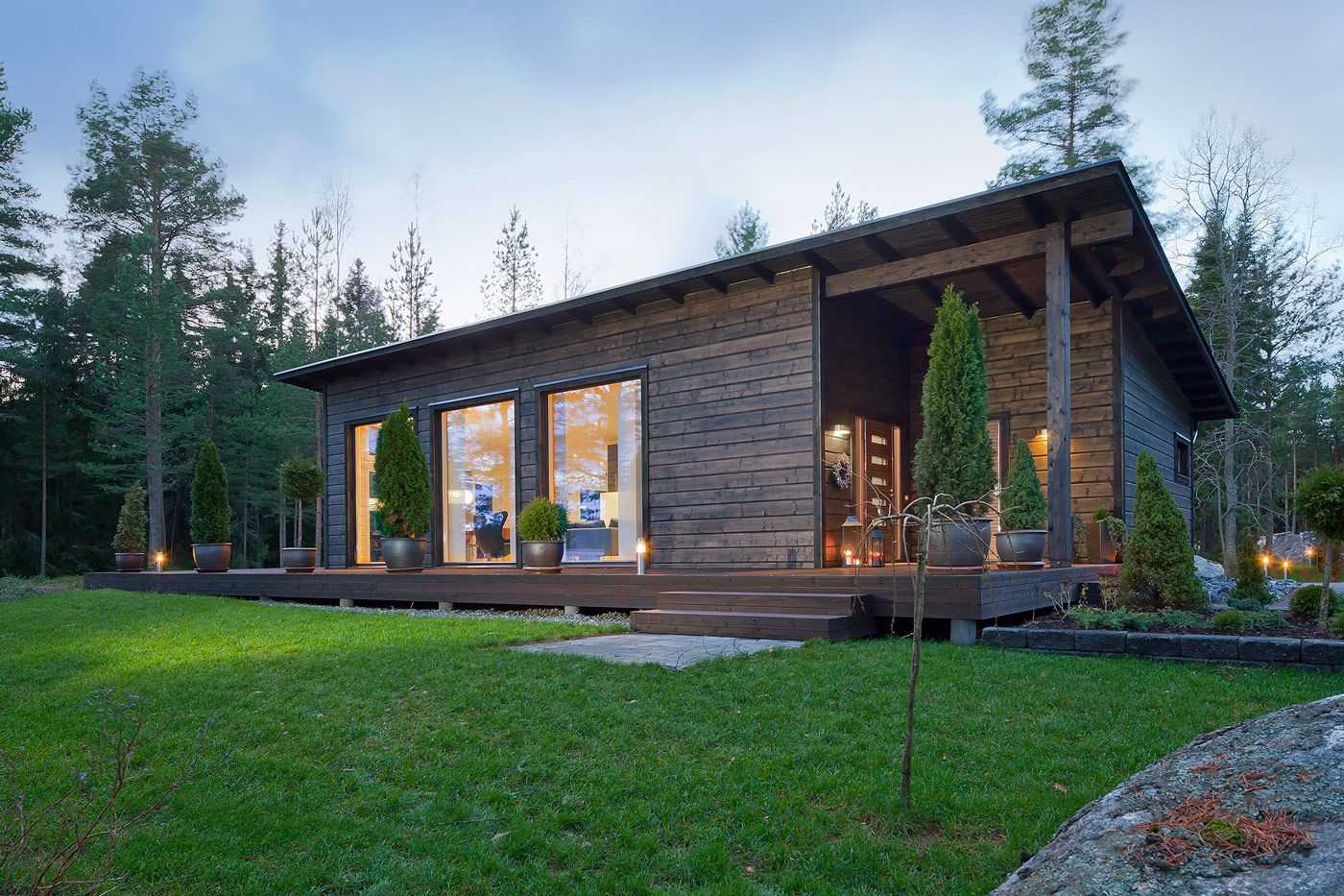 Один из популярных вариантов наружного оформления — панорамная стеклянная стена на фасаде. В Финляндии часто прямо в доме обустраивают баню или сауну. Фундамент делают свайный, ленточный или плитный. Кровлю покрывают черепицей — классической глиняной, гибкой или металлической.