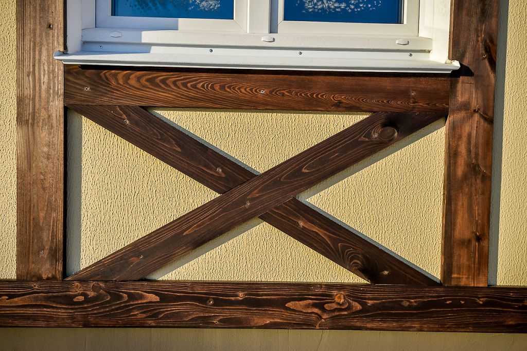 Стиль фахверк представляет собой облицовку фасада деревянными досками, расположенными по силовым линиям каркаса. Основной и единственный элемент усиления такой отделки имеет название «ласточкин хвост». Он представляет собой точку соединения трех досок: одна расположена по вертикали, а две других – по диагонали. Торцы боковых планок спилены под углом так, чтобы получился равнобедренный треугольник.