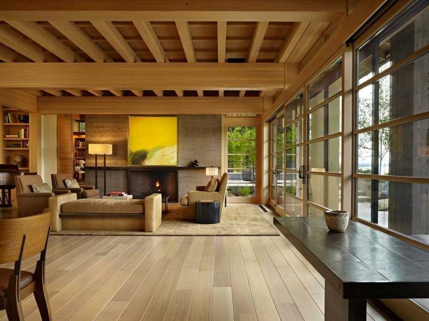 Потолочные балки создают в помещении эффект монументальности, поэтому подходят для просторных комнат. Если жилье маленькое, тогда применяют имитации из тонких досок. Приветствуются панорамные окна или крупные блоки с несколькими створками. Стены можно оформить как деревом, так и фактурной штукатуркой. На полу обязательно теплый натуральный ламинат.