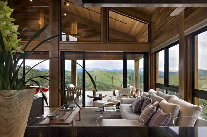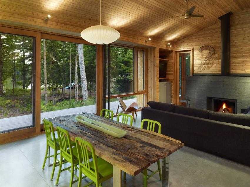 Самые технологичные стили, такие как техно, индустриальный стиль и хай-тек будут неуместны в доме из натурального дерева. Хотя панорамное остекление при высоких потолках, отсутствие вертикальных перегородок (открытые межэтажные пространства) или оштукатуренные стены с современными материалами потолков (когда натуральный деревянный потолок зашивают, закрывают балки) расширяют выбор интерьерных решений.