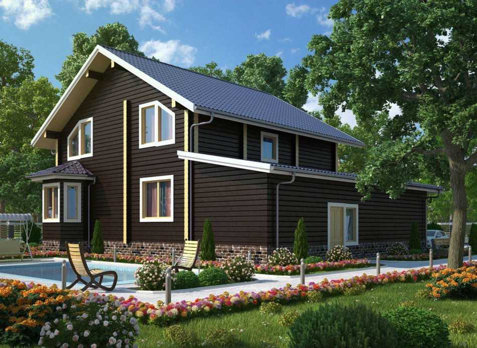Двухэтажные дома с мансардой имеют презентабельный внешний вид. Такие дома предназначены для комфортного загородного или дачного отдыха. Как правило, планировка двухэтажного дома с мансардой предусматривает расположение комнат общего пользования на первом уровне (это могут быть гостиная, столовая, кухня), а личные апартаменты – на втором этаже (спальни хозяев, ванная комната, детские). Выбирая материалы, можно остановиться на бетоне, кирпиче или дереве. Возможны комбинированные варианты, где один этаж выполнен из бруса, а другой – из кирпича. Ниже представлен проект №10, заключительный в нашей подборке.