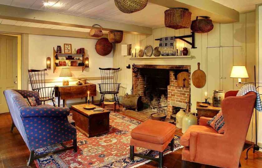 Чехлы и покрывала из текстиля на мягкой мебели, паркетный пол, цветастые обои, шпон из дерева – характерные особенности этого стилевого направления.